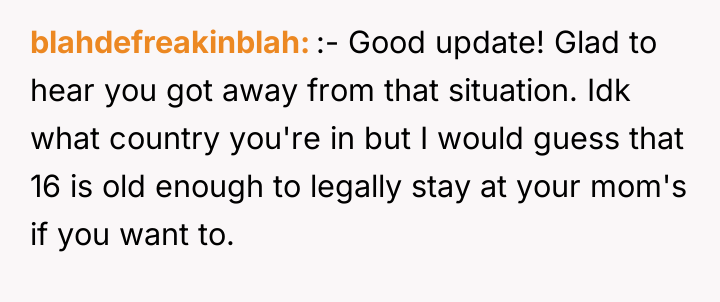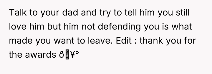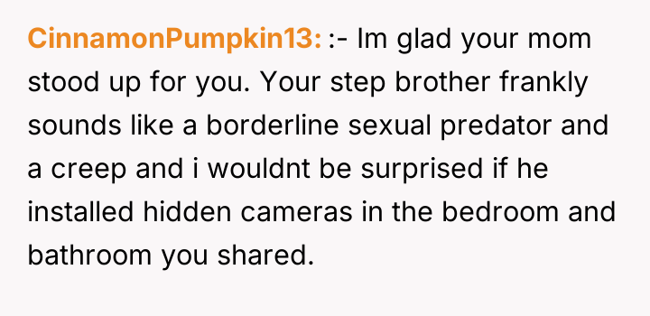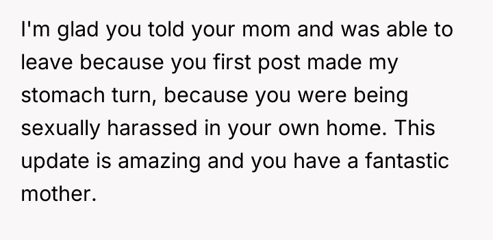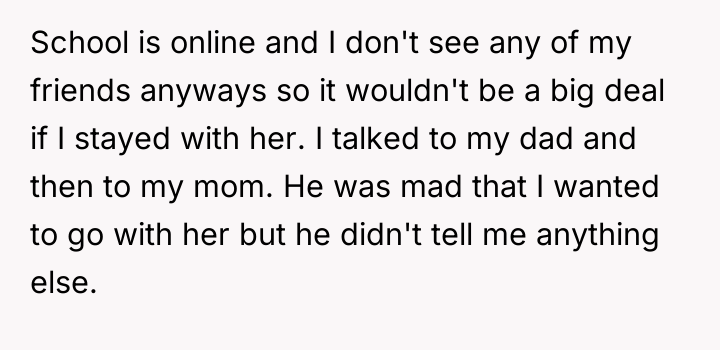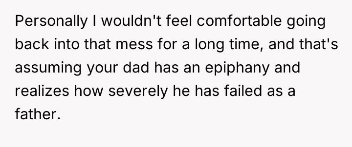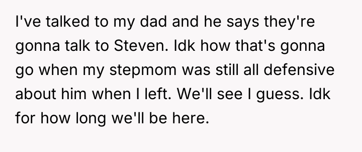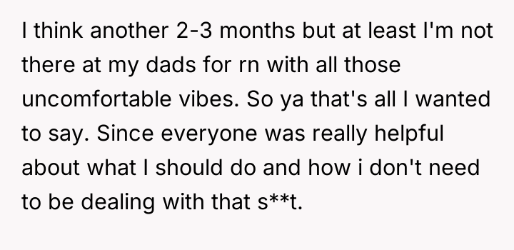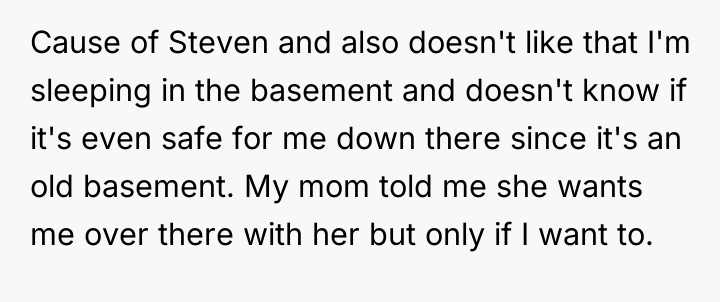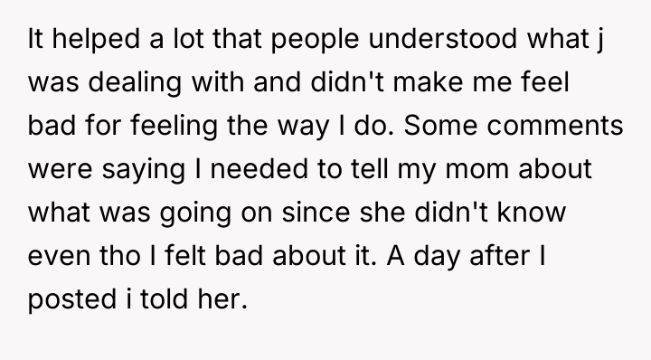 The original poster (OP) experienced significant family conflict after asserting a boundary regarding shared living space following a sensitive disclosure by a family member. Feeling invalidated and unsupported by their father and stepmother, the OP sought external validation which ultimately led to them temporarily relocating to stay with their mother. The central conflict revolves around the OP's need for personal safety and comfort versus the family's expectation that the OP should maintain the status quo despite feeling distressed.
