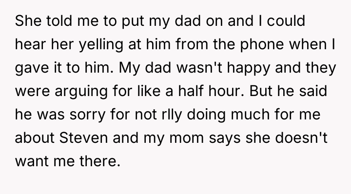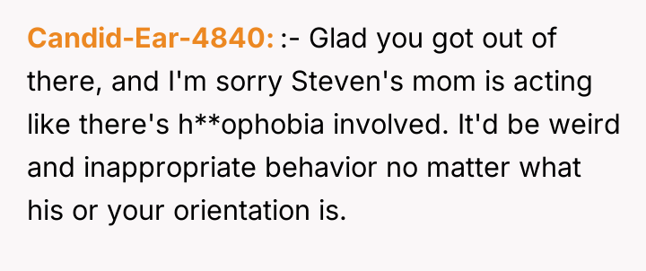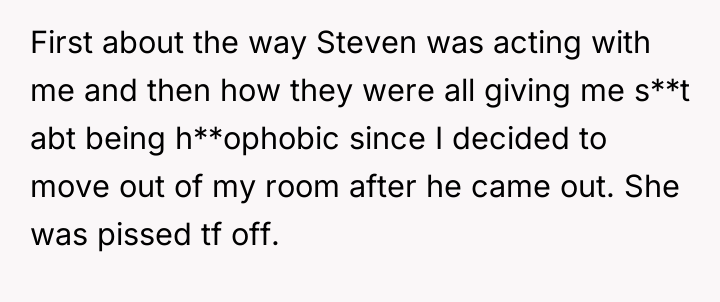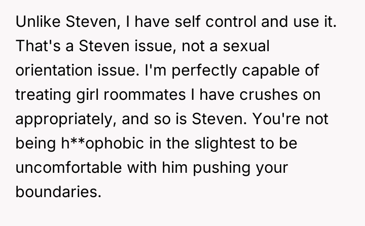 As renowned researcher Dr. Brené Brown explains, “Boundaries are the distance at which I can love you and me simultaneously.” In this situation, the OP established a necessary, albeit drastic, boundary when they felt unsafe or deeply uncomfortable sharing their living space following Steven’s disclosure. The family's reaction, particularly the accusation of homophobia and the failure to immediately address the OP’s distress, indicates a breakdown in validating each other's emotional reality. The OP was forced to prioritize their mental space over maintaining the immediate peace of the household. The father’s initial inaction and subsequent anger when the OP decided to stay with the mother suggest a dynamic where compliance was valued over addressing the core issue causing the distress. The mother, conversely, provided immediate physical support and a safe, private environment, reinforcing the OP's right to self-preservation. This divergence highlights differing approaches to conflict resolution and support within the parental unit. The OP’s decision to leave was an appropriate, albeit emotionally taxing, measure to protect their well-being when direct communication channels failed to yield respect for their needs. Moving forward, the OP should focus on clear, non-accusatory communication about future needs, emphasizing 'I feel' statements, rather than reacting to accusations like being called homophobic. The family needs to learn that boundaries are not rejections, but tools for sustainable relationships.