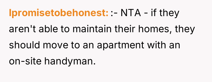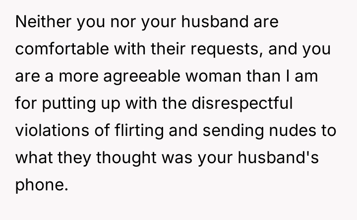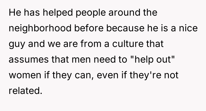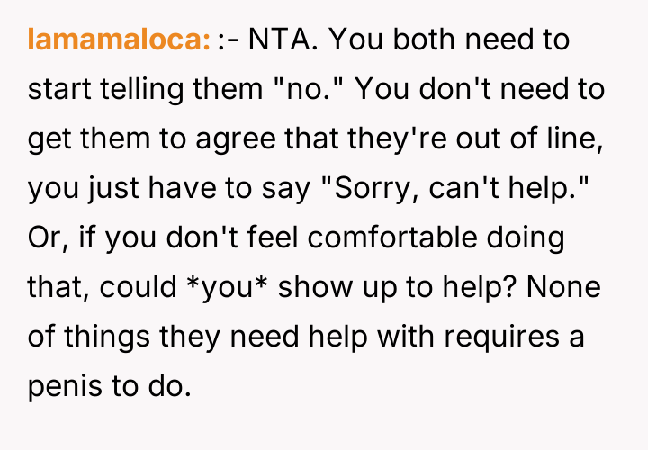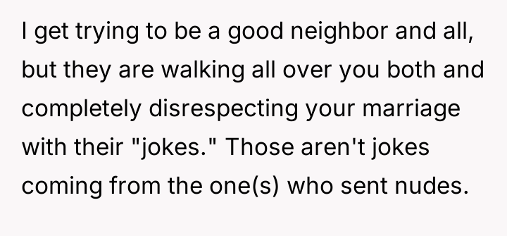 As renowned researcher Dr. Brené Brown explains, “Boundaries are the distance at which I can love you and me simultaneously.” This situation highlights a severe breakdown in establishing and enforcing healthy personal boundaries, not just between the OP and the neighbors, but also potentially within the communication dynamic between the OP and her husband regarding external pressure. The neighbors are exhibiting a form of collective entitlement, transforming a neighborly favor into an expected service, underpinned by inappropriate emotional and sexual objectification of the husband. Their argument that maintenance requests are 'not even safe' and that the OP should be more 'understanding' due to their relationship status (2020 context) is a form of emotional manipulation designed to negate the OP’s legitimate concerns. Furthermore, the comments about the OP needing to have children to 'earn' her husband’s fidelity demonstrate a profound ethical violation and an attempt to shift blame onto the victim for the aggressors' behavior. The OP’s actions to address the situation—including establishing ground rules about her husband only helping when she accompanies him and attempting a group meeting—were appropriate initial steps. However, given the neighbors’ hostile response (demanding shared access and criticizing her marriage), continued casual conversation is unlikely to succeed. The constructive recommendation is for the OP and her husband to jointly present a unified, non-negotiable boundary moving forward: all future maintenance requests must go through a formal, non-personal channel (like a paid service), and any further harassment or inappropriate contact must result in documented, escalating consequences, including contact with property management or legal counsel if necessary.