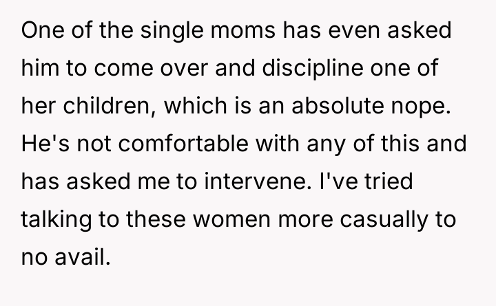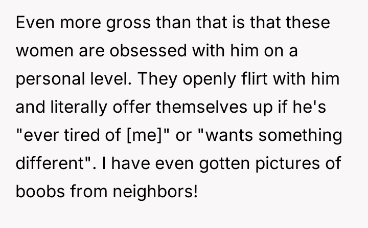 The original poster (OP) is dealing with intense boundary violations and objectification directed at her husband by her all-female neighbors. Despite the OP's efforts to communicate and set limits, the neighbors insist on relying on the husband for constant maintenance tasks and express inappropriate, flirtatious interest in him, citing isolation as justification. The core conflict lies between the OP’s need for privacy and respect within her marriage and the neighbors’ collective, demanding expectation that the husband should be a communal resource, both practically and emotionally.