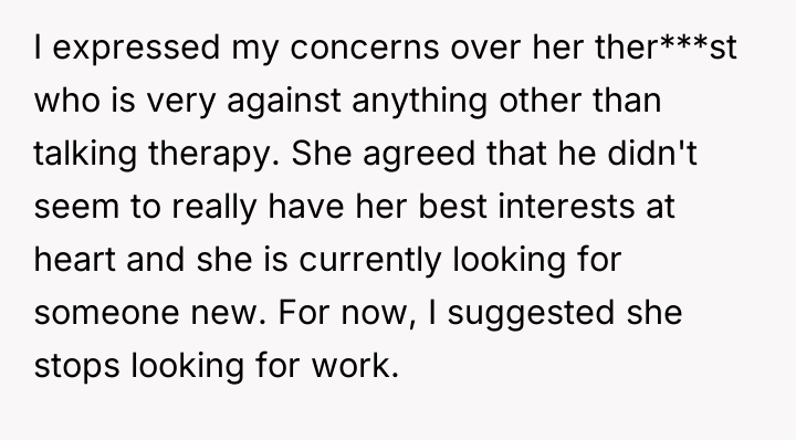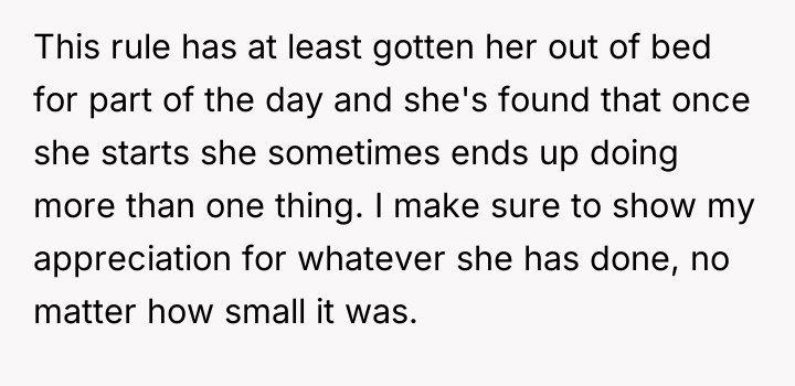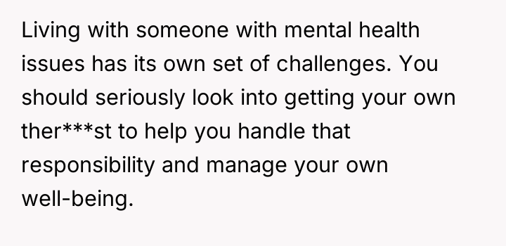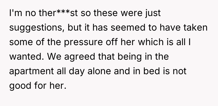 As renowned researcher Dr. Brené Brown explains, “Boundaries are the distance at which I can love you and me simultaneously.” This situation highlights a complex interplay between setting necessary personal limits and offering compassionate support within a relationship struggling with mental illness. The OP's initial reaction stemmed from burnout and unmet expectations, leading to destructive communication ("calling her lazy"). While destructive, this outburst prompted necessary, albeit difficult, conversations about the relationship's operational structure. The current compromise—the girlfriend pausing her job search, focusing on self-care (like yoga), and taking on one chore—is a constructive way to establish manageable boundaries for her current capacity. The OP’s commitment to researching depression shows a shift from criticism to informed support, which is crucial for partners supporting someone with mental health challenges. The OP’s actions in apologizing and restructuring expectations—moving from large, overwhelming goals (finding any job, general housework) to small, achievable ones (one chore, 10-minute exercise)—were appropriate for de-escalating conflict and building immediate stability. For future effectiveness, the OP should ensure that these temporary arrangements include agreed-upon check-in points to review when the girlfriend feels ready to resume job searching, ensuring that financial support does not unintentionally become a long-term barrier to her autonomy.