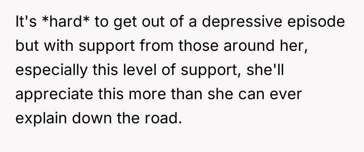 Given the successful implementation of smaller chore routines and shared cleaning days, should the OP continue to take the lead on financial support and domestic labor until the girlfriend's mental health stabilizes, or does this arrangement risk reinforcing a dependency that could hinder her long-term recovery?