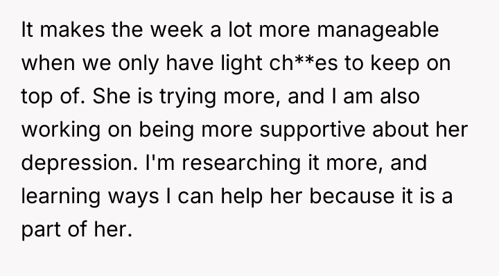 UPDATE: AITA for telling my girlfriend that being depressed is not an excuse for being lazy?
