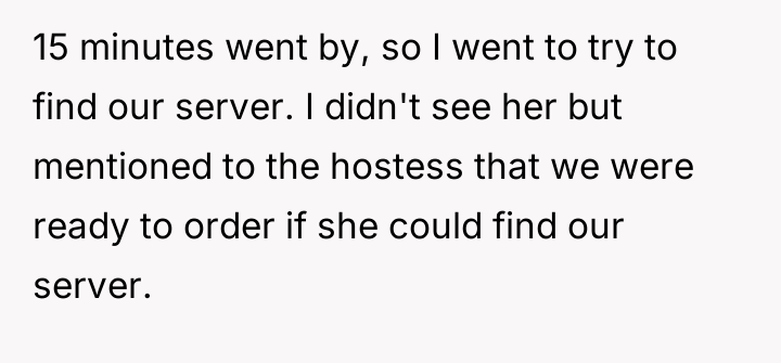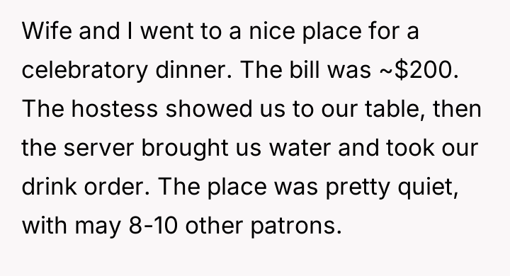 A husband and wife went out for a celebratory dinner at a quiet restaurant where the total bill was around $200. After being seated, the couple waited a significant amount of time before a server approached them, even for drinks. The husband, the original poster (OP), tried to signal their readiness to order to the hostess after the initial long wait.