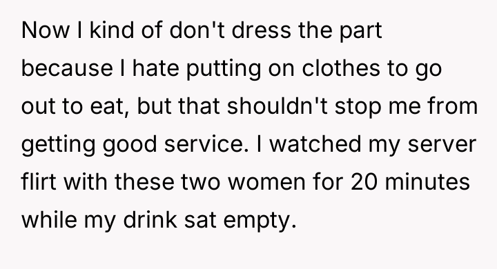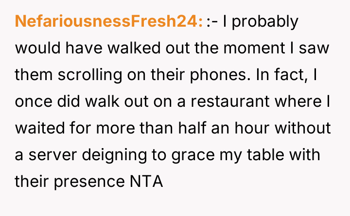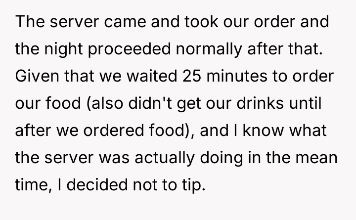 After another extended period, the OP found both the server and the hostess distracted by their phones at the front desk. The OP directly addressed them to place their order, which caused both staff members to react with surprise. Because of the 25-minute delay in service and the observation of the staff's inattention, the OP decided to withhold the tip, leading to an internal conflict about their actions.