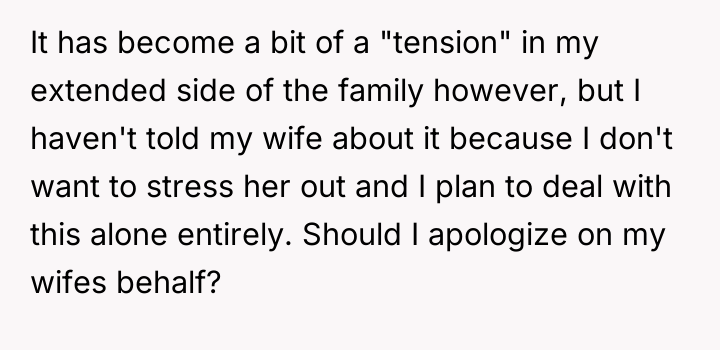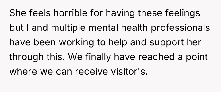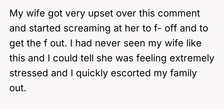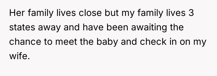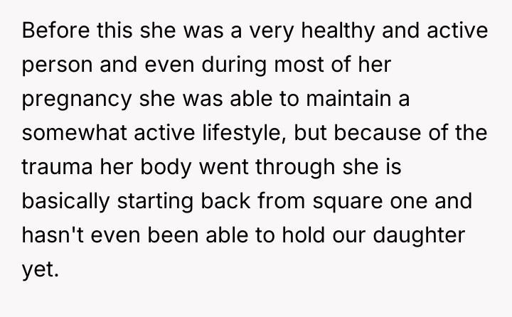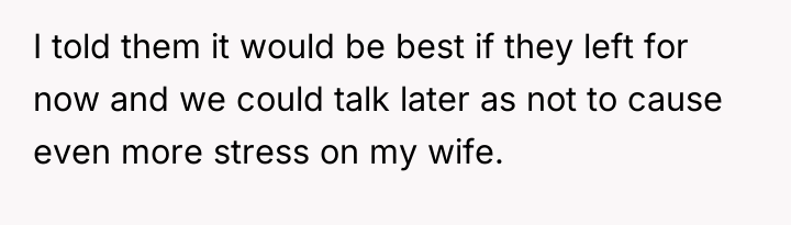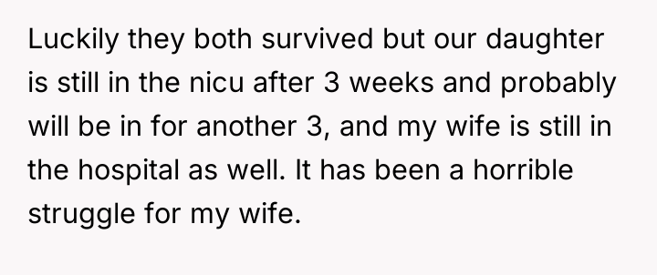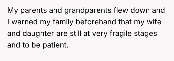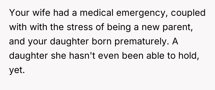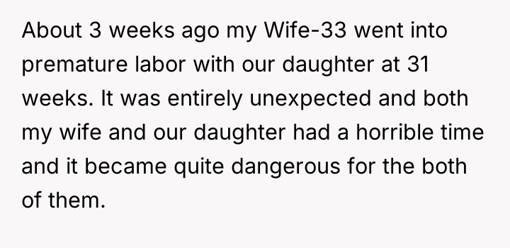 The original poster (OP) is currently caught between protecting his wife, who is suffering from severe medical trauma and emotional distress following a dangerous premature birth, and managing the offense taken by his visiting family members. His central conflict lies in prioritizing his wife's immediate need for a safe, supportive environment over his family's expectation that he should reprimand his wife or apologize for her reaction.
