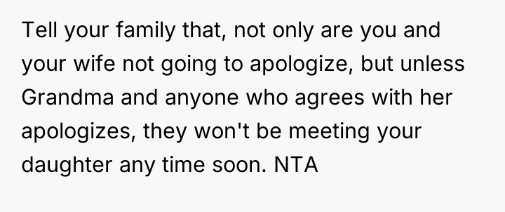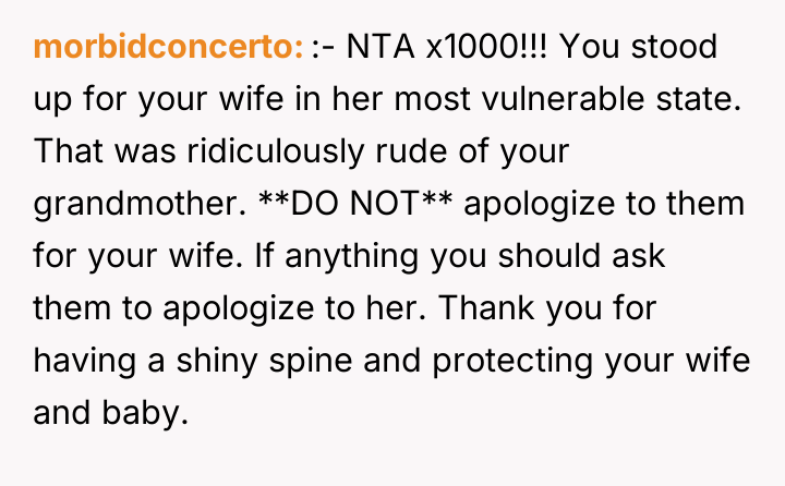 Given the extreme vulnerability of both the wife and the newborn, is the OP correct in shielding his wife entirely from family conflict and choosing not to apologize for her outburst, or does his responsibility to maintain family harmony require him to mediate the situation by offering an apology to his grandmother?