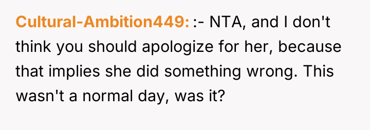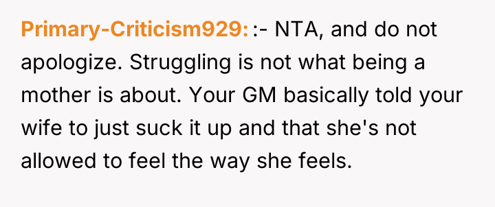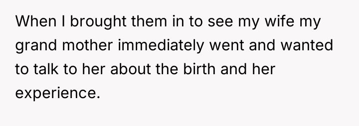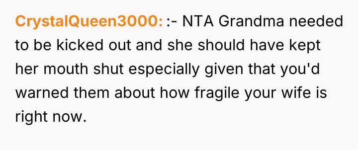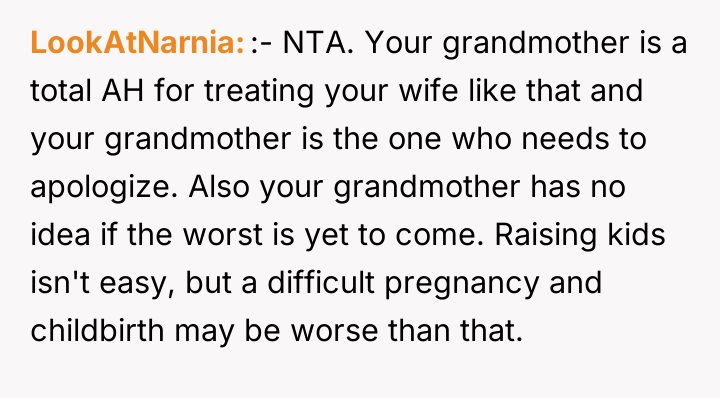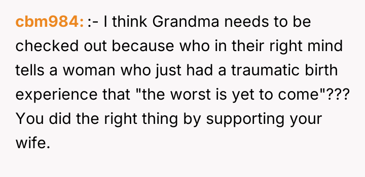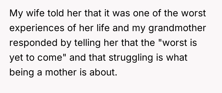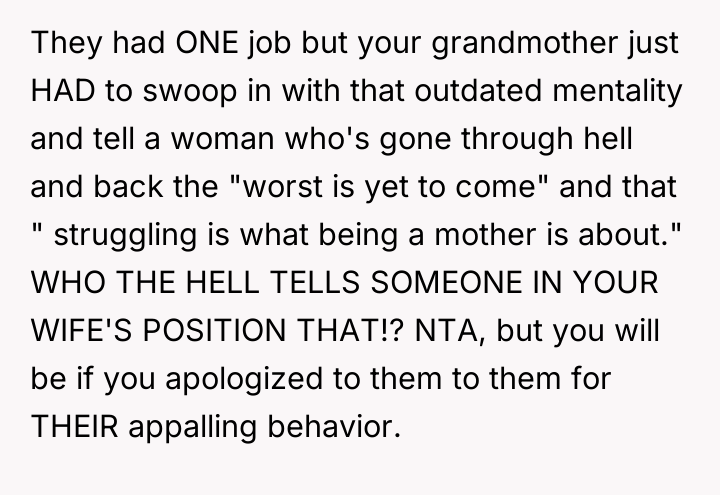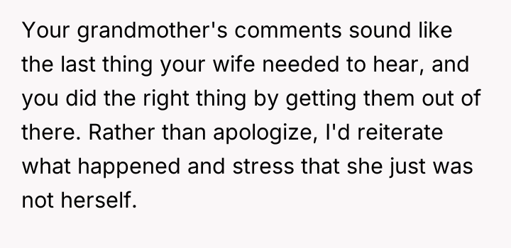 As renowned researcher Dr. Brené Brown explains, “Boundaries are the distance at which I can love you and me simultaneously.” In this high-stress medical crisis, the wife's outburst, while severe, was a raw, immediate defense of her emotional space against invalidation during a period of profound physical and psychological vulnerability. The wife is experiencing significant birth trauma, betrayal by her body, and the anxiety of having a critically ill infant in the NICU. When her grandmother offered a dismissive platitude—telling her the "worst is yet to come"—this directly undermined the wife's current suffering and shattered the fragile sense of safety she needed. Her reaction, though intense, was an extreme boundary enforcement mechanism triggered by compounded stress and emotional pain. The OP correctly identified the need to immediately remove the stressor. The OP’s decision to shield his wife from the subsequent family tension is appropriate in the short term, as her recovery is the absolute priority. Constructively, however, the OP should address the family tension by clearly communicating *why* the grandmother's words were harmful, focusing on the medical reality and the wife's trauma, rather than apologizing for her behavior. Future interactions require setting firm communication boundaries about what topics are off-limits until the wife is medically and emotionally stable.