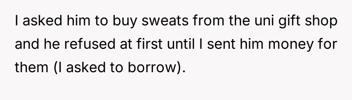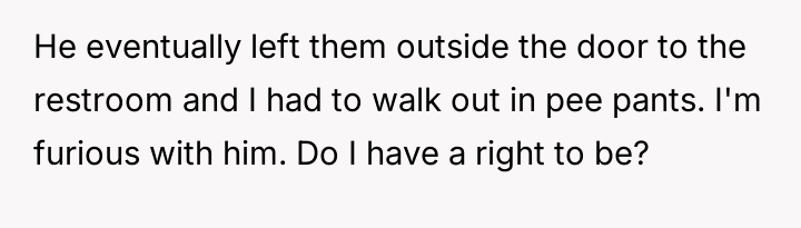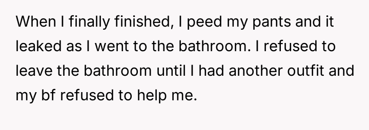 OP reached out to her boyfriend (BF) for a*sistance, specifically asking him to purchase and bring her a change of clothes from the campus gift shop. However, the BF initially refused to help unless she sent him money first and then refused to bring the clothes directly to her inside the women's restroom, forcing her to walk out of the stall in wet clothing. This situation left OP feeling furious and questioning the validity of her anger toward her boyfriend's lack of support.