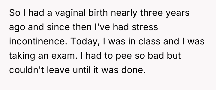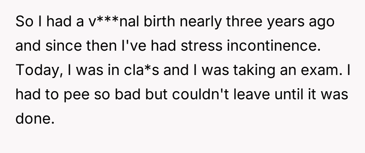 The original poster (OP) experienced an accident during a university exam where, due to stress incontinence from a previous childbirth, she wet her pants after holding her need to urinate for too long. After the incident, she was in a difficult situation as she needed to change her soiled clothes immediately.