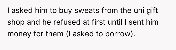 OP reached out to her boyfriend (BF) for assistance, specifically asking him to purchase and bring her a change of clothes from the campus gift shop. However, the BF initially refused to help unless she sent him money first and then refused to bring the clothes directly to her inside the women's restroom, forcing her to walk out of the stall in wet clothing. This situation left OP feeling furious and questioning the validity of her anger toward her boyfriend's lack of support.