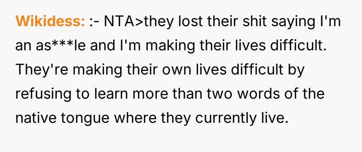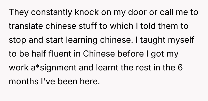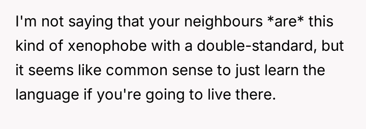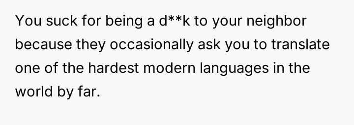 As renowned sociologist Dr. Milton J. Bennett explains, “Intercultural communication competence involves moving from ethnocentric stages of denial and defense to ethnorelative stages of minimization and acceptance.” This situation highlights a significant failure in intercultural adaptation by the British couple, putting undue emotional and linguistic labor onto the OP. The OP's frustration stems from a perceived imbalance of effort in cultural integration. While the OP proactively learned Mandarin, the neighbors relied on cultural enclaves and the availability of others (like the OP) to mediate their daily lives. This reliance often breeds dependency and a sense of cultural insulation, which the OP correctly identified as inconsiderate after several years of residency. The neighbors' reaction—calling the OP an 'asshole'—is a common defense mechanism when a non-integrated party faces a loss of their established support system; they externalize blame rather than accept responsibility for their lack of effort. The OP’s actions in setting the boundary—refusing translation and switching languages—were appropriate for asserting self-respect and encouraging integration, though the method of delivery (confrontation) escalated the emotional response. Moving forward, while setting firm boundaries is necessary, practicing 'compassionate boundary setting'—perhaps by offering resources or phased reduction of help rather than an immediate cutoff—might reduce such severe negative reactions in shared living situations.