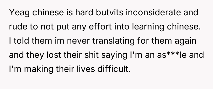 The original poster (OP) is clearly frustrated by the perceived laziness and entitlement of the long-term British residents who rely heavily on the OP for translation despite living in China for several years. The central conflict arises from the OP setting a firm boundary against providing further translation services, which the neighbors reacted to with anger and accusations.