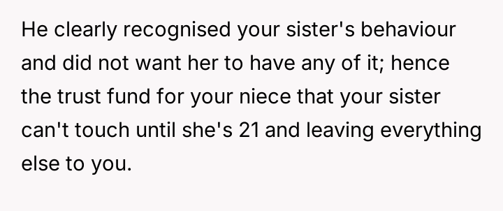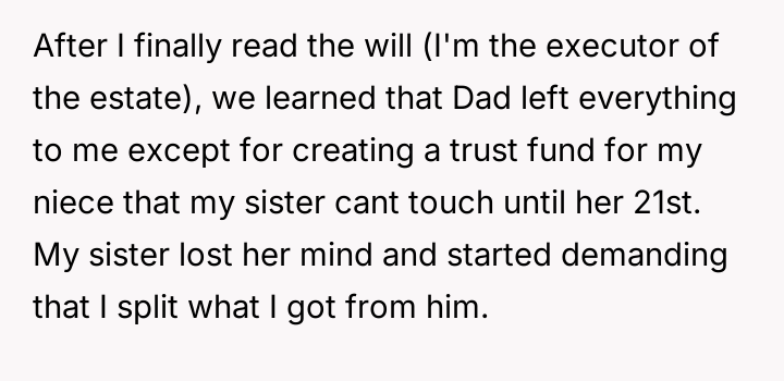 The sister's immediate demand to see the will and claim property before the father is even laid to rest showcases a profound lack of empathy and an entitlement rooted in years of parental accommodation. The father's decision to leave the bulk of the estate to the OP, while setting up a trust for the niece that bypasses the sister, is a clear judgment on past behaviors, effectively establishing a boundary the father wished to maintain even after his death. The OP, as executor, is ethically and legally bound to honor these documented instructions.