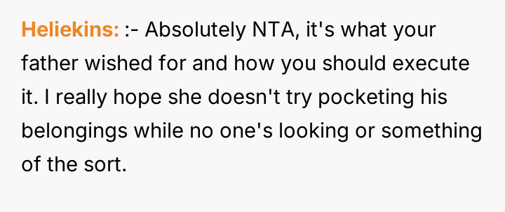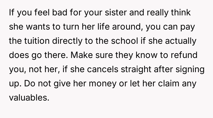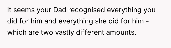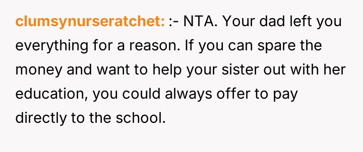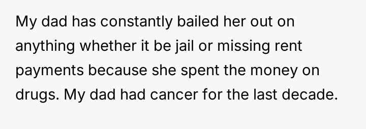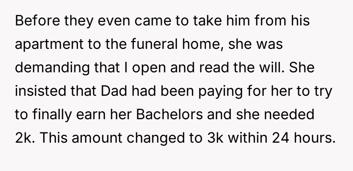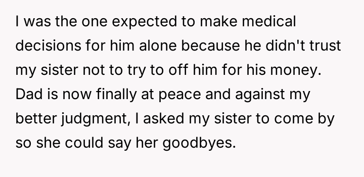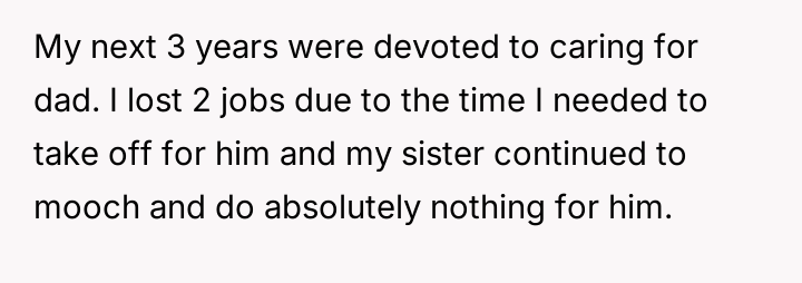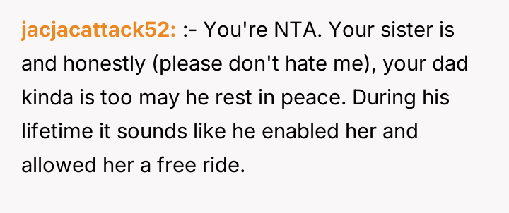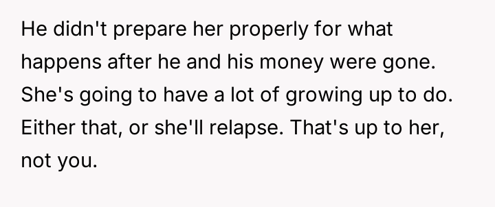As renowned researcher Dr. Brené Brown explains, “Boundaries are the distance at which I can love you and me simultaneously.” In this situation, the OP is dealing with the aftermath of a long history of enabling behavior, where the sister has consistently relied on the father for financial rescue without reciprocating care, especially during the father's final illness.