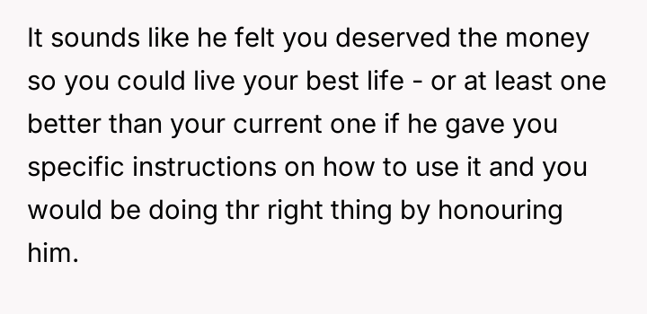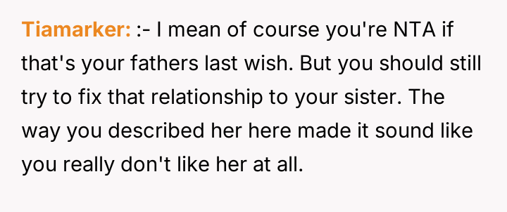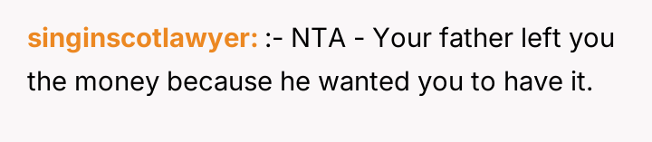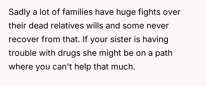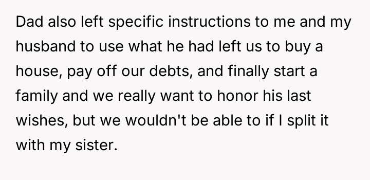 The original poster (OP) is attempting to honor their late father's final wishes, which involve using the inheritance to secure housing and start a family. This conflicts directly with the sister's aggressive demands to immediately access and split the estate funds, fueled by past dependency and resentment over the will's contents.