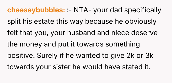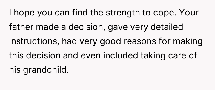 The OP’s actions to respect the father's explicit wishes are appropriate, especially considering the financial security the father intended for the OP and their future family. Moving forward, the OP should communicate strictly through legal channels regarding the estate distribution, focusing on fulfilling the trust for the niece, while firmly declining the sister's demands for immediate cash distribution. This maintains the necessary emotional and financial boundary.