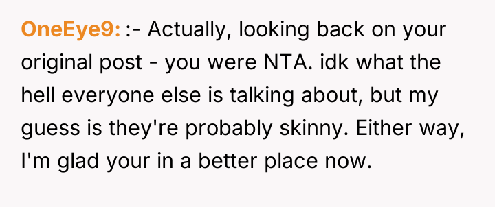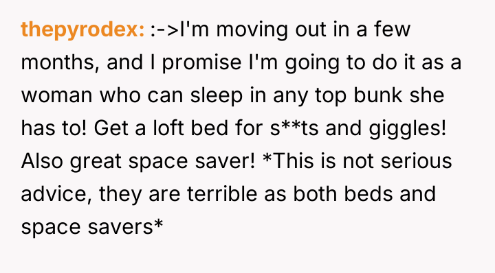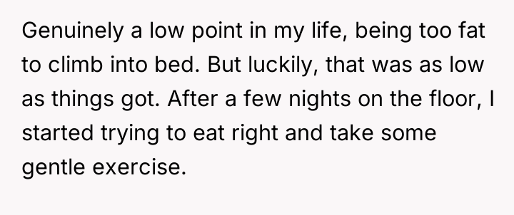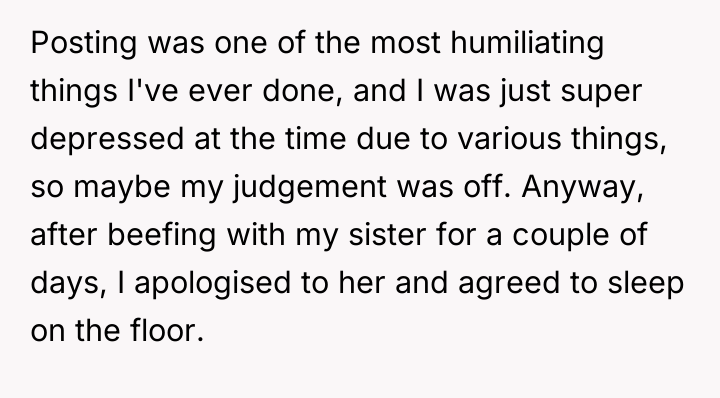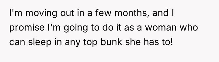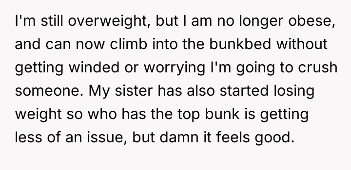 As renowned researcher Dr. Brené Brown explains, “Boundaries are the distance at which I can love you and me simultaneously.” The OP’s initial situation stemmed from a conflict concerning physical space and capability (the bunk bed), which served as a catalyst for addressing a deeper personal issue: weight and physical health. While the OP initially acted out of self-preservation based on a physical reality—being unable to use the top bunk—the community feedback indicated that this demand functioned as an unfair imposition on the sister. The OP’s acceptance of responsibility (sleeping on the floor) was a crucial step in acknowledging the impact of their needs on others, even if motivated by distress. The subsequent, self-directed weight loss demonstrates a powerful example of internalizing constructive criticism and transforming a moment of shame into significant positive change. This situation highlights that while setting boundaries is essential, self-awareness regarding one’s own limitations and their external impact is equally important. Moving forward, the OP should focus on clear, proactive communication about physical needs before conflicts arise, rather than relying on last-minute demands that force others into accommodating roles.