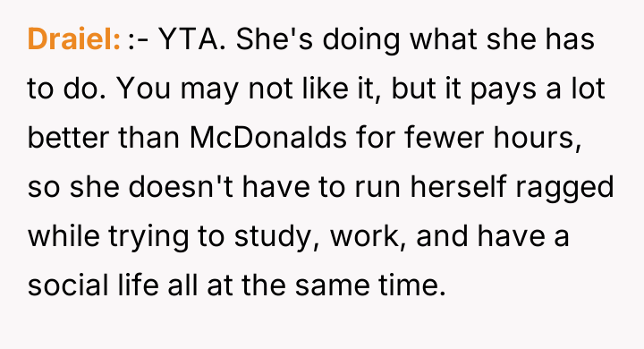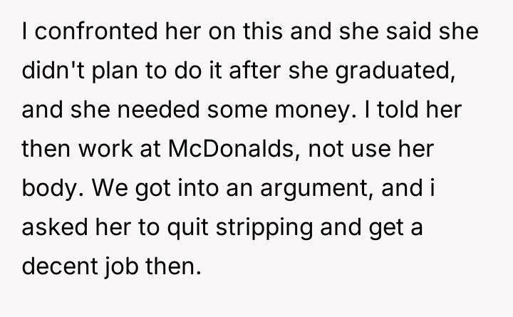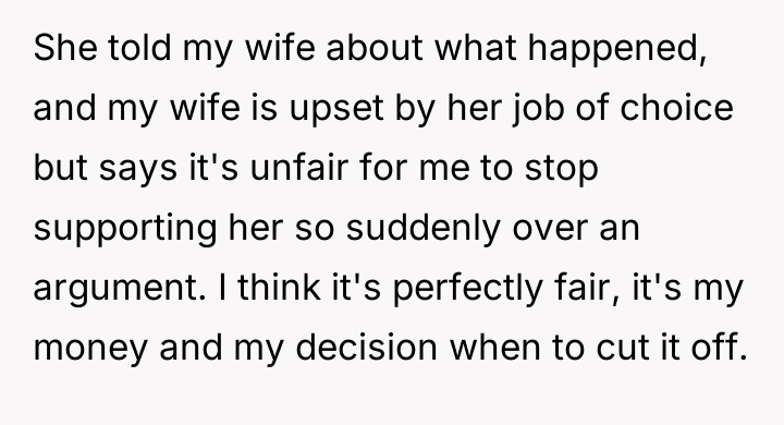 As renowned researcher Dr. Brené Brown explains, “Boundaries are the distance at which I can love you and me simultaneously.” In this scenario, the father is attempting to establish a boundary based on his moral code by weaponizing financial support, which is a common, though often counterproductive, pattern when deeply held values are challenged. The daughter, a 22-year-old college student, is demonstrating agency by seeking quick income, even if the source is ethically objectionable to her father. Her motivation is clearly financial necessity, as evidenced by her claim that the income from stripping is needed because her alternative earnings are insufficient to cover both her living expenses and the car payment. The father's sudden withdrawal of the car payment, while technically within his rights as the payer, functions as punishment rather than constructive boundary setting. This shift transforms a supportive agreement into a conditional tool, likely damaging trust and communication. The father's action was overly punitive and lacked a phased approach to boundary renegotiation. A more constructive approach would involve transparently discussing the moral conflict first, perhaps offering a short transition period where support continues while the daughter seeks alternative employment, or setting clear conditions for future support. The immediate cut-off escalated the argument and shifted the focus from the daughter's career choice to financial insecurity.