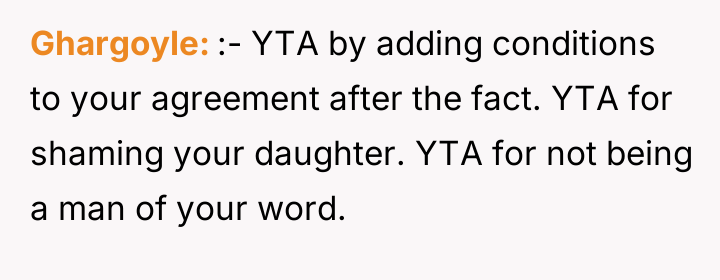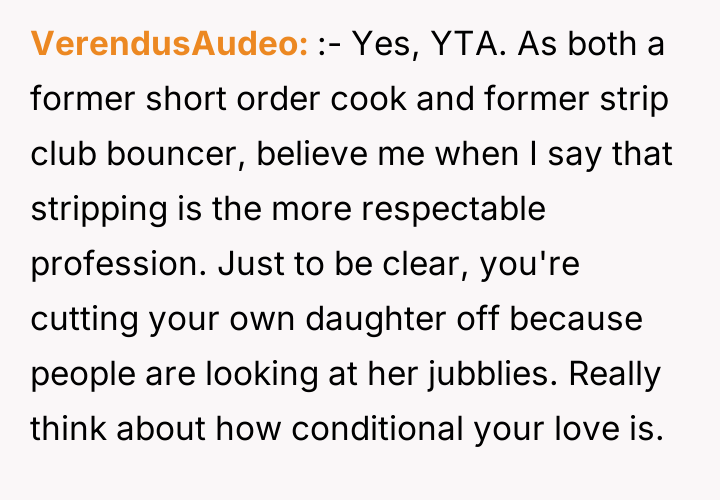 Given the clash between the father's moral objection and the daughter's need for financial stability, the core question remains: Is it justifiable for a parent to immediately cease agreed-upon financial support as a direct consequence of discovering employment they morally disapprove of, or does the prior commitment necessitate continued support until an alternative, acceptable agreement is reached?