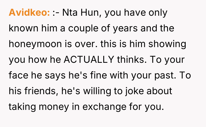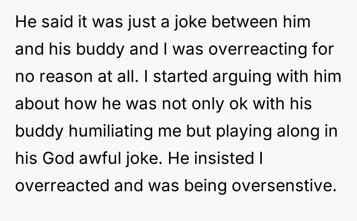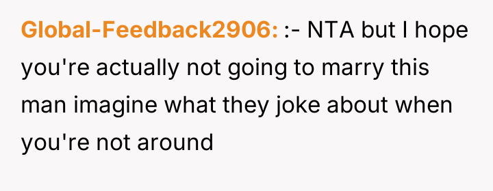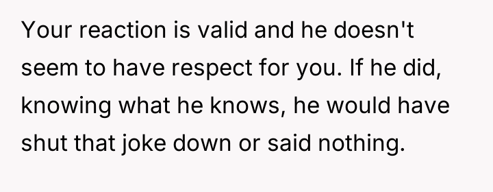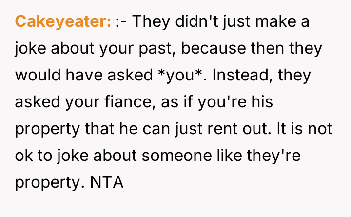 The original poster (OP) faced a deeply hurtful situation where her fiancé publicly validated a derogatory joke about her past, turning her moment of celebration into one of intense humiliation. Her action to leave immediately stemmed from the betrayal of trust when the person who claimed unconditional love joined in the mockery, contrasting sharply with the support she received from his family.