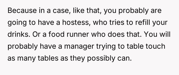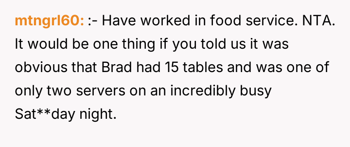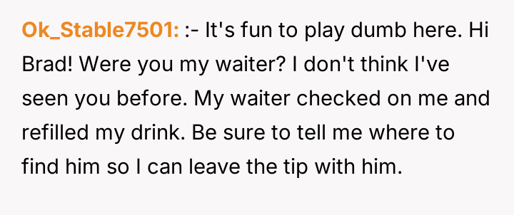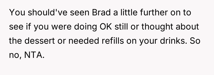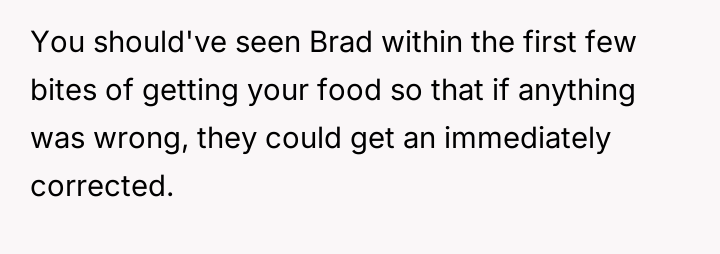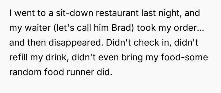 The Original Poster (OP) recently visited a sit-down restaurant where their a*signed waiter, referred to as Brad, took the initial order but then seemingly abandoned service duties. Brad did not check on the OP, refill drinks, or deliver the food, which was handled by a different staff member.