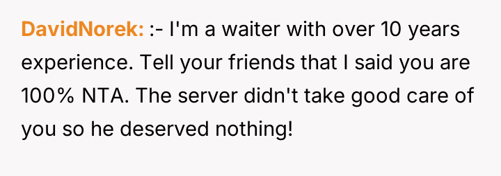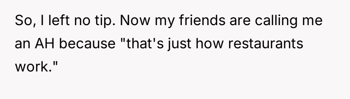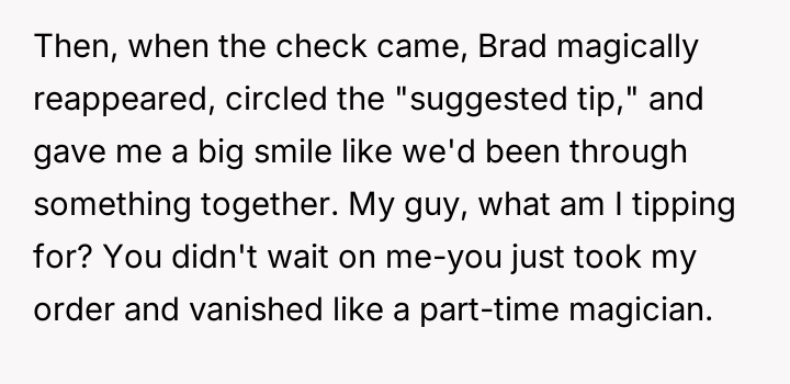 When the bill arrived, Brad reappeared to present the check and pointed out the suggested tipping section with a friendly demeanor. Dissatisfied with the lack of actual service provided, the OP chose to leave no tip. Now, the OP faces criticism from friends who argue that this behavior is standard practice in the industry, leaving the OP to question whether their action was unfair.