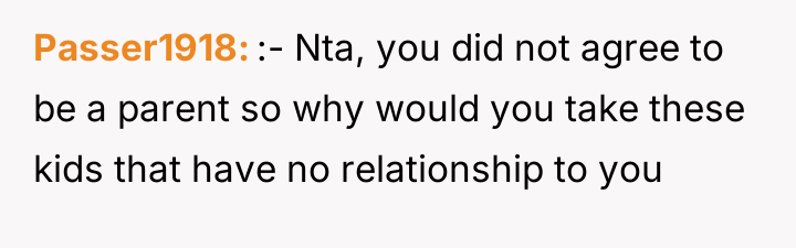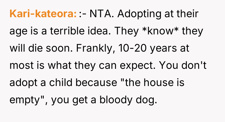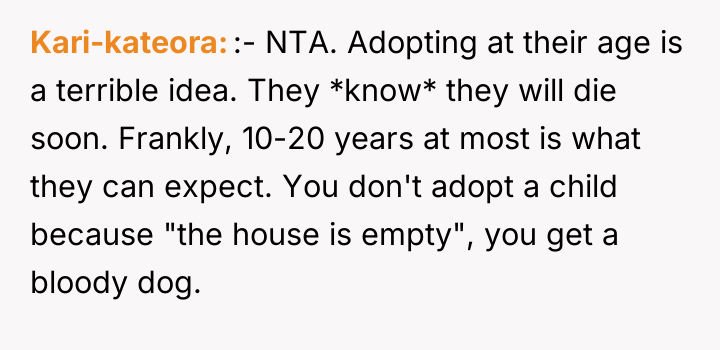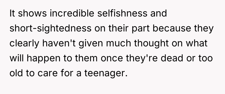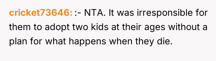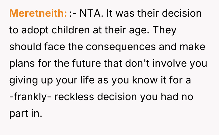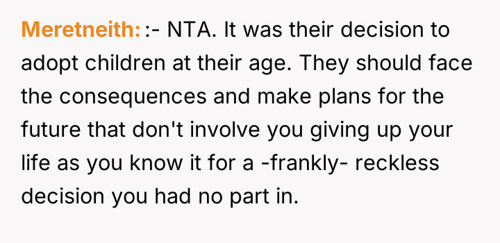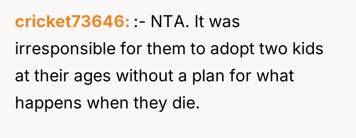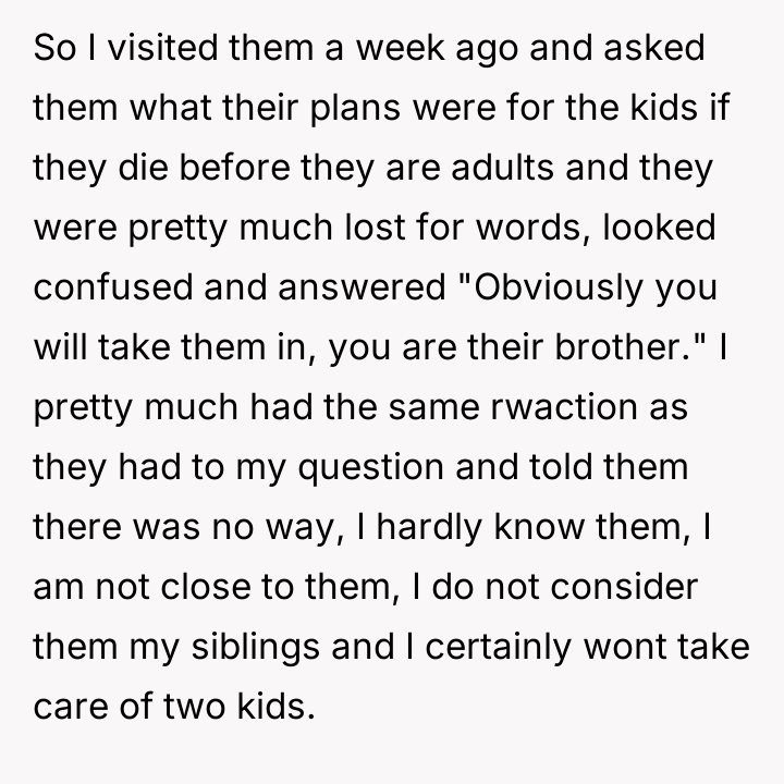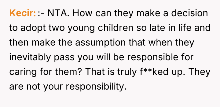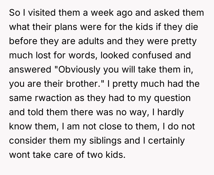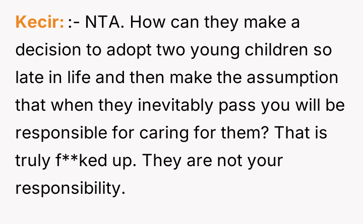 As renowned family therapist and author Dr. Terrence Real explains, “Boundaries are not about controlling other people; they are about choosing what you will own and what you will not own in terms of responsibility.” This situation strongly highlights a fundamental boundary breach initiated by the parents, albeit one likely driven by profound anxiety rather than malice. The parents, having adopted young children late in life, appear to have engaged in 'planning fallacy,' minimizing the significant practical and emotional burden they were placing on their 26-year-old son. Their immediate assumption that the OP would automatically become the default guardian shows a failure to communicate openly about estate planning and guardianship before the adoption, transferring immense emotional labor onto the OP. The OP’s reaction—refusing the responsibility—is understandable given the near-stranger status of the children and the drastic disruption this would cause to their life trajectory. However, the parents' desperation stems from the fact that they have seemingly exhausted all other avenues, leaving the OP as the last resort before the state intervenes. The OP's actions in setting a firm boundary were appropriate for preserving their autonomy, but the delivery (a sudden confrontation) escalated the conflict. A more constructive approach would have involved initiating conversations about guardianship alternatives months or years before the direct confrontation, perhaps exploring trusts or legal arrangements that allow for financial support without requiring physical custody. Professionally, while the OP is not 'wrong' to decline guardianship, they must now engage in clear communication to establish alternative, non-custodial support mechanisms for the children's financial future, if possible, rather than avoiding the issue entirely.