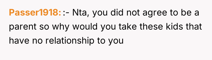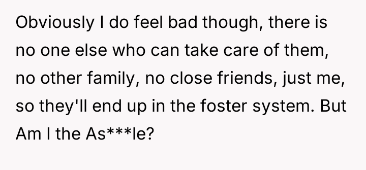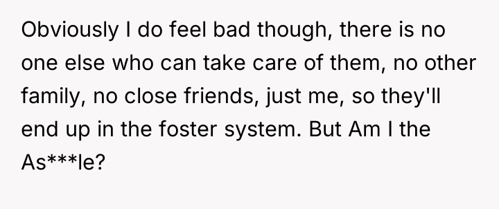 Given the absolute lack of other family support for the young children, is the OP ethically obligated to accept the responsibility of raising two half-siblings they barely know, or does their right to protect their established independence and future outweigh the potential consequence of the children entering the foster care system?