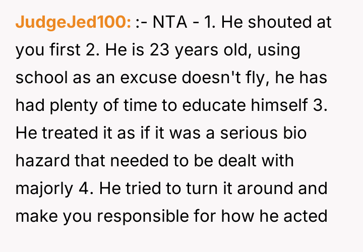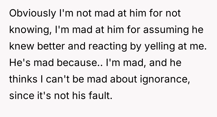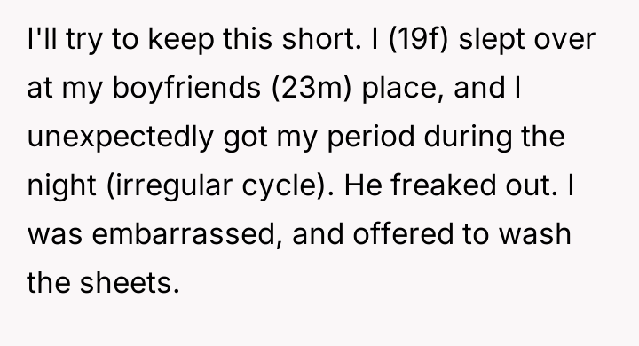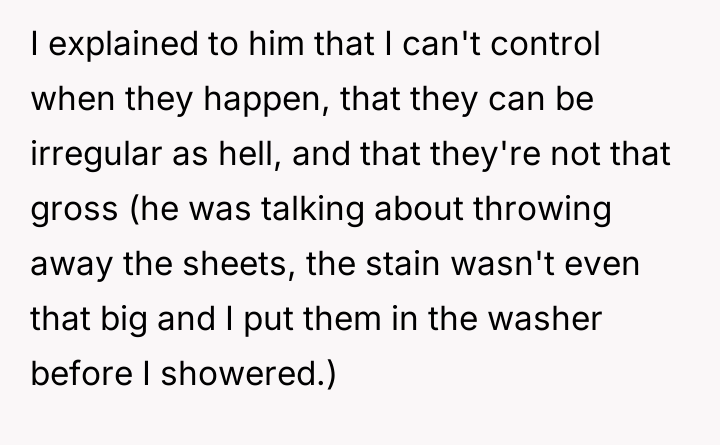The core issue here is the boyfriend’s disproportionate reaction and subsequent refusal to take responsibility for his emotional delivery. While the boyfriend may genuinely lack education regarding irregular menstrual cycles—a societal failing, not necessarily a personal moral failing—his response of yelling, name-calling ("irresponsible and disgusting"), and continuing the argument demonstrates a severe lack of emotional regulation. The OP's anger is entirely justified, not because he didn't know about periods, but because he chose aggression over calm communication when faced with an unexpected situation. His attempt to shift blame by stating, "I couldn't have known," attempts to negate the impact of his yelling by neutralizing the cause.