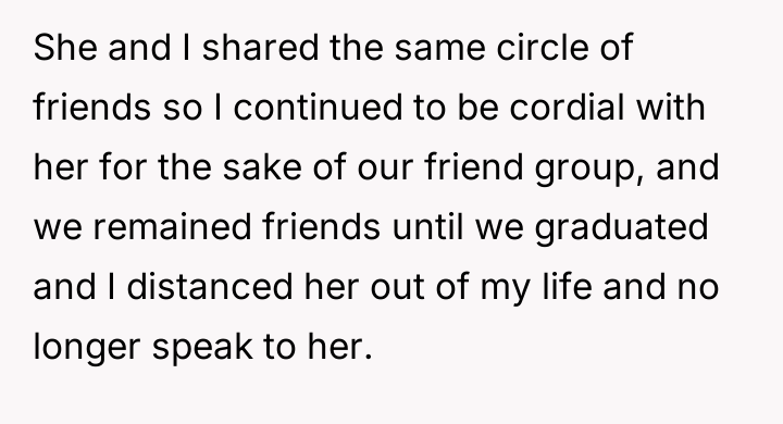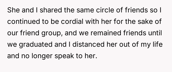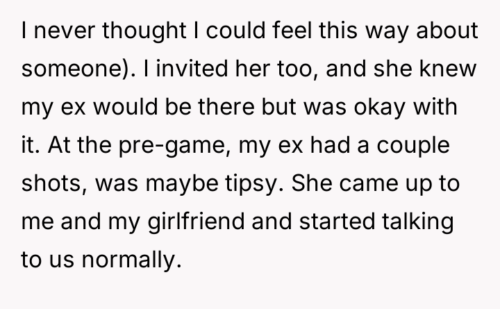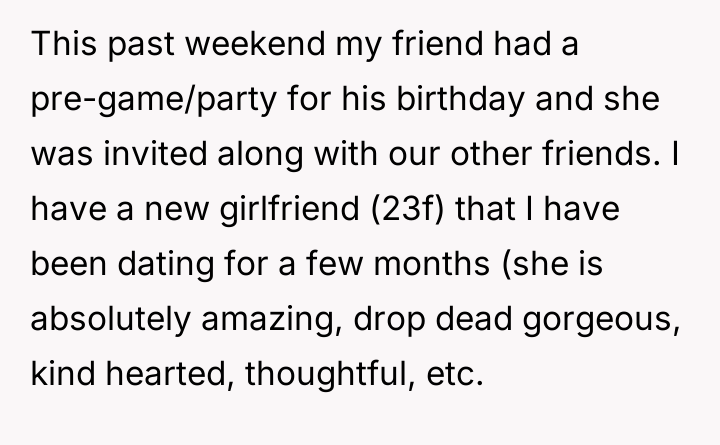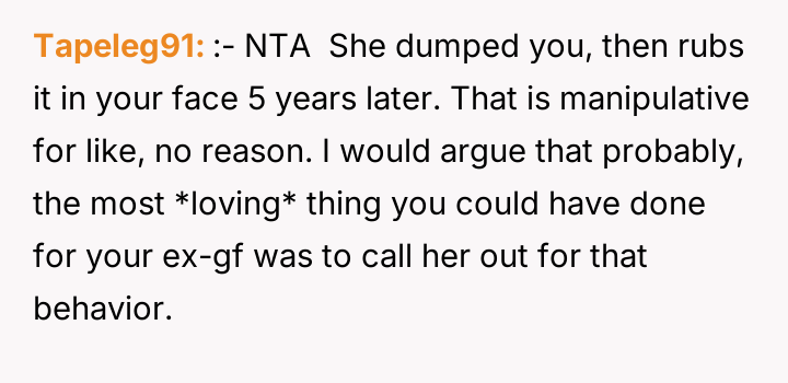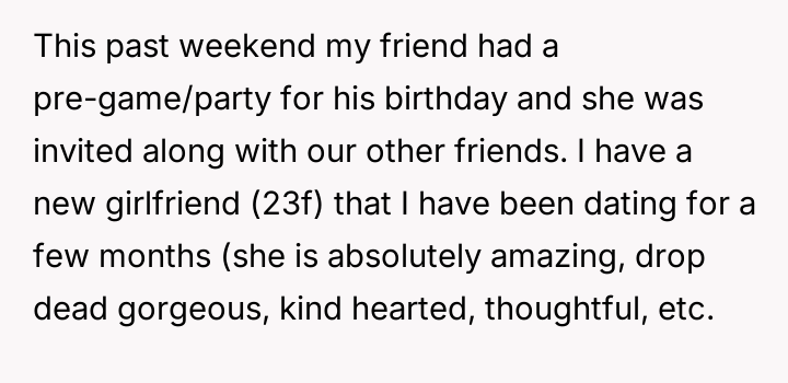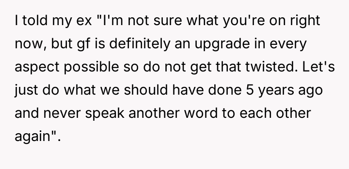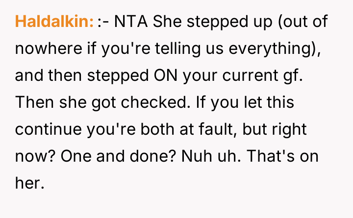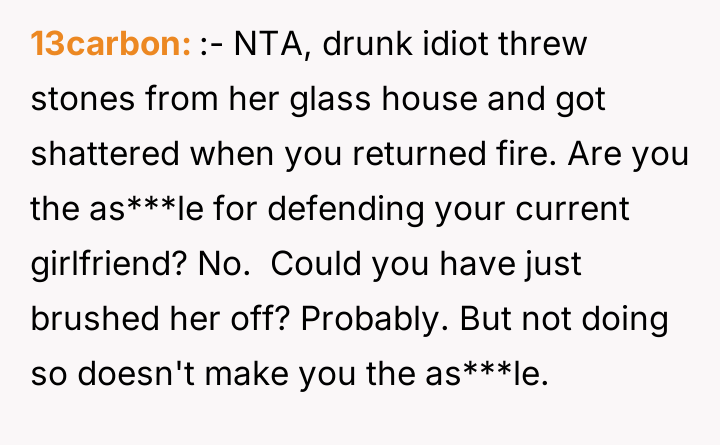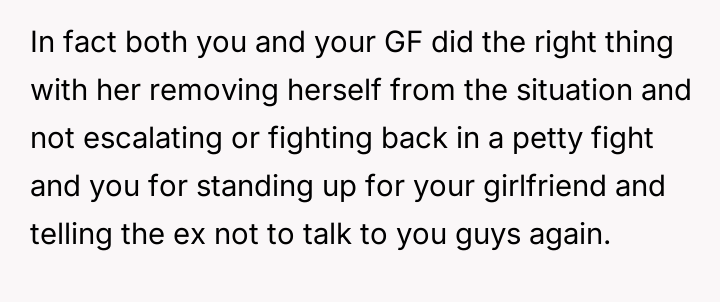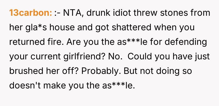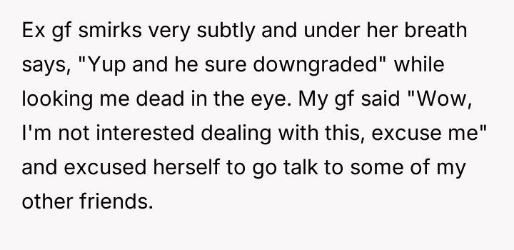 The Original Poster (OP) experienced a difficult situation where his ex-girlfriend made a public, insulting comment about his current partner shortly after an unrelated interaction. The OP responded strongly, defending his new relationship and severing future contact, which led to the ex-girlfriend becoming distressed and withdrawing from the friend group.