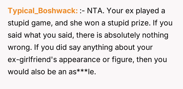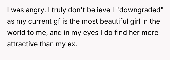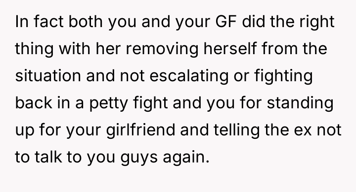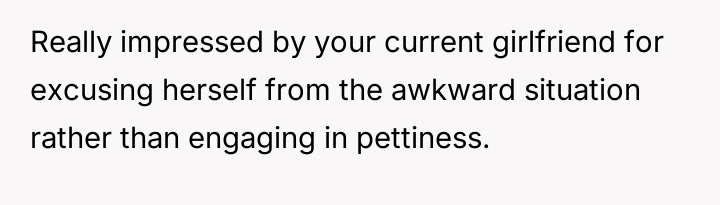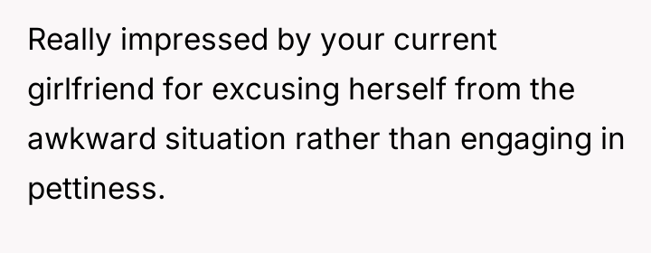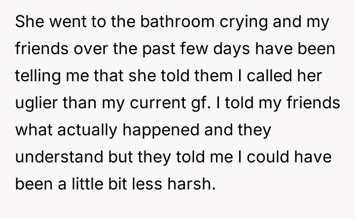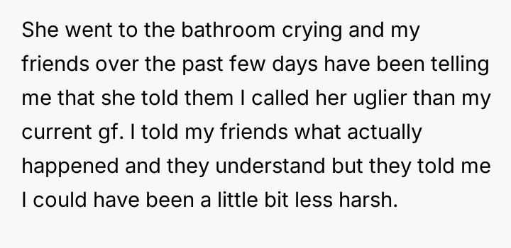 The OP's friends suggested he could have been 'less harsh.' While always aiming for diplomacy is ideal, in the face of a direct, belittling attack on a partner, immediate and unambiguous defense is often required. The OP acted appropriately in prioritizing his current partner's dignity over the ex-girlfriend's temporary comfort. For future situations, if such conflict arises, the OP can state the boundary firmly but calmly, perhaps focusing solely on the inappropriate comment rather than issuing a global decree about who is 'better looking,' which can sometimes fuel retaliatory narratives, as seen when the ex reportedly misrepresented the exchange to mutual friends.