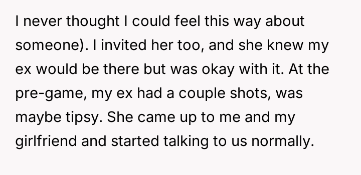 The OP's ex-girlfriend clearly struggled with setting appropriate social boundaries, especially after consuming alcohol, by making a deliberate, targeted insult toward the OP and his current girlfriend. This action shows a lack of respect for the OP's current relationship and suggests unresolved feelings or a desire to assert dominance following the past breakup. The OP's reaction—immediately defending his girlfriend and issuing a final boundary ('never speak another word')—was a clear and necessary response to protect his partner from further disrespect. While his words were harsh, they directly addressed the unacceptable behavior exhibited by the ex-girlfriend.