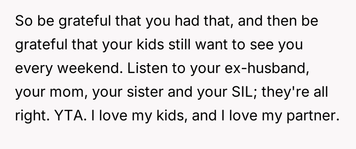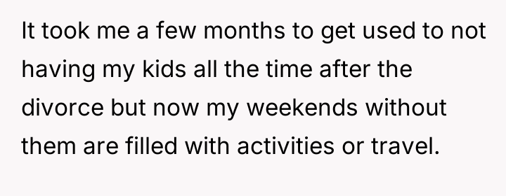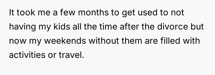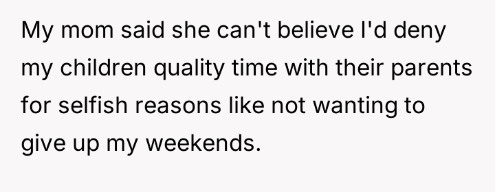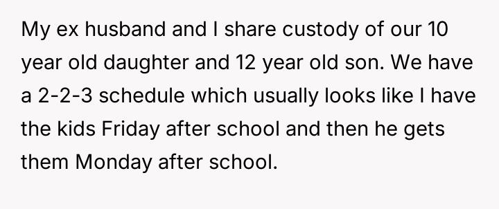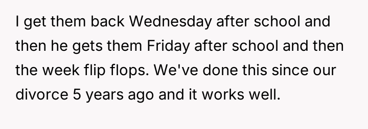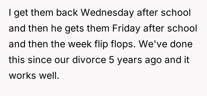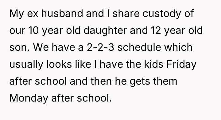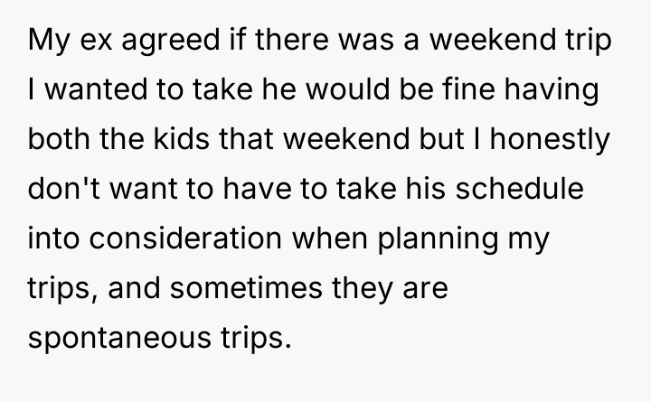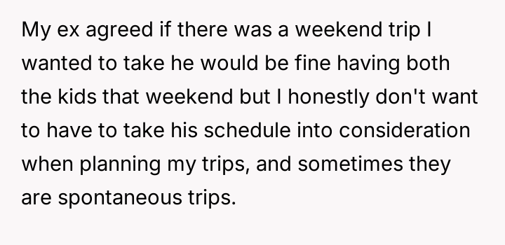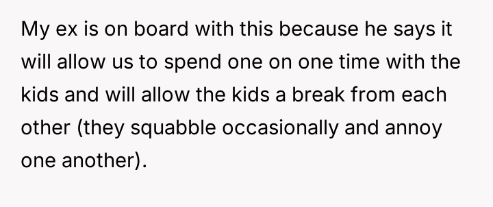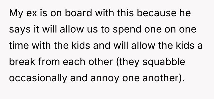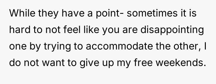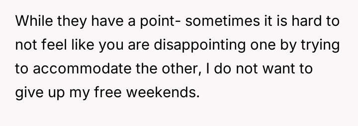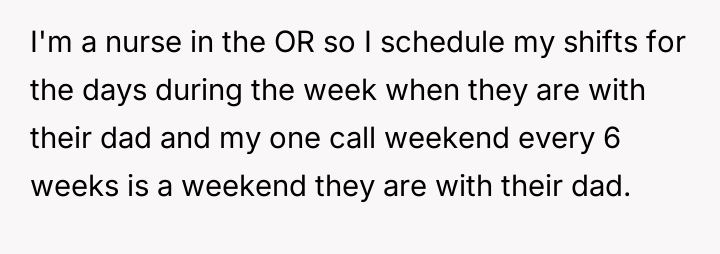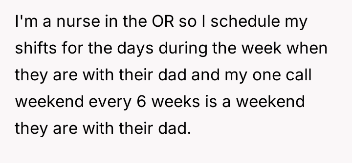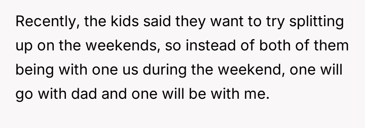 As renowned family therapist and researcher Dr. Christine Allen states, “In post-divorce co-parenting, the goal shifts from pleasing everyone to establishing clear, sustainable boundaries that serve the functional needs of the entire family unit, including the parents’ capacity to parent effectively.” The OP’s resistance stems from a justifiable need to protect the personal time she has built as a necessary coping mechanism and personal fulfillment structure post-divorce. Her established schedule allows her to manage the demands of nursing while ensuring her non-working weekends are restorative. The children’s request, while motivated by a desire for quality one-on-one time and reduced sibling conflict, directly challenges the OP’s established adult autonomy. The family's reaction suggests a misunderstanding of the emotional labor involved in co-parenting and the legitimate need for post-divorce decompression time, framing her boundary setting as 'selfishness.' The ex-husband’s immediate agreement highlights a potential difference in how the parents value their non-custodial time, which is common but needs careful navigation to avoid one parent feeling penalized. The OP’s actions in wanting to maintain her schedule are appropriate given the stability the current system provides and her career demands. However, completely dismissing the children's request may lead to resentment. A constructive recommendation is to explore a compromise: perhaps implementing the split schedule only during certain, less travel-intensive times of the year (e.g., during school months) or limiting the split to only one weekend per month, thus preserving the majority of her free weekends while still validating the children's stated needs.