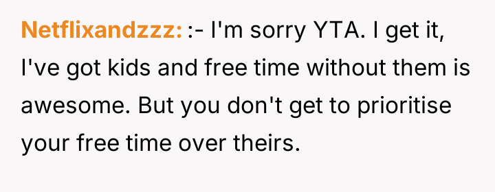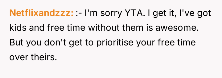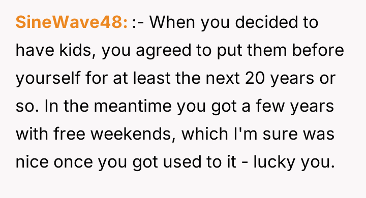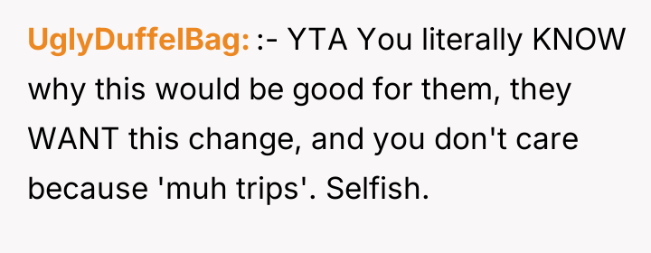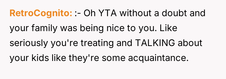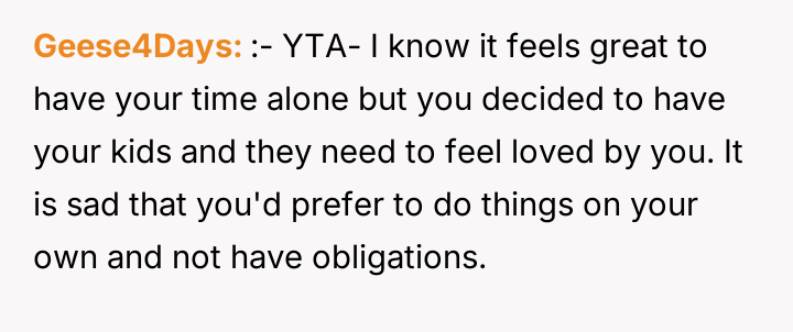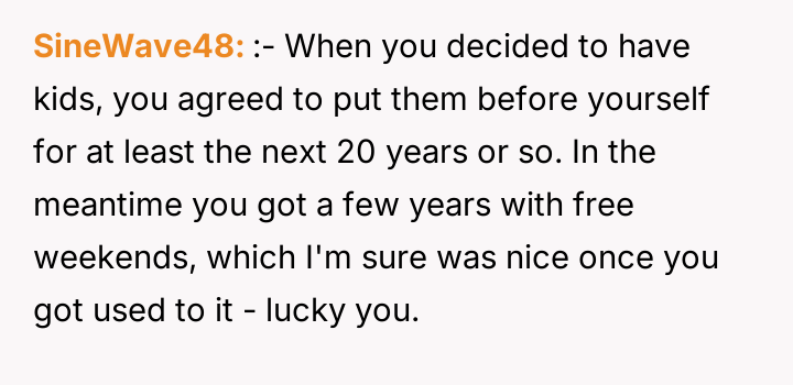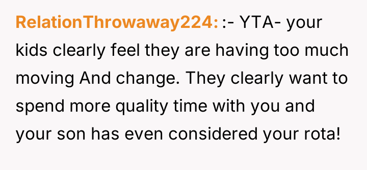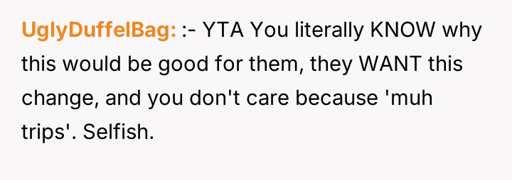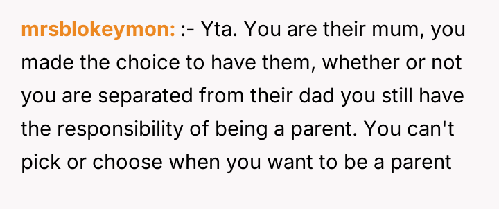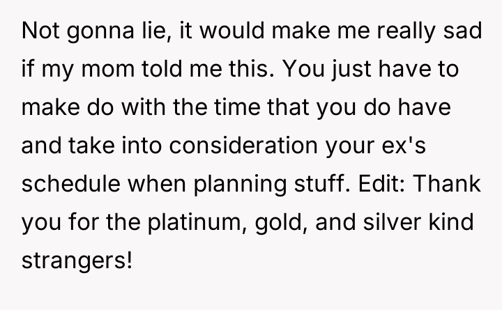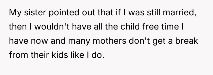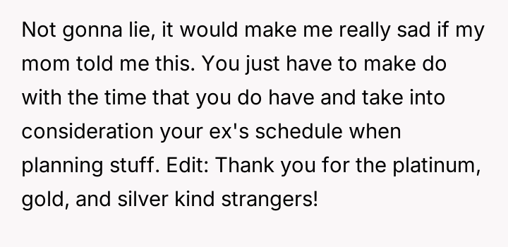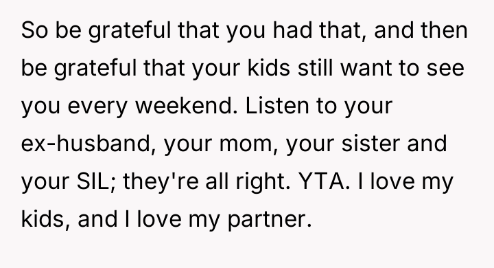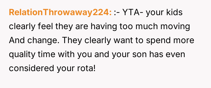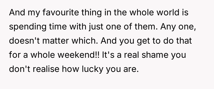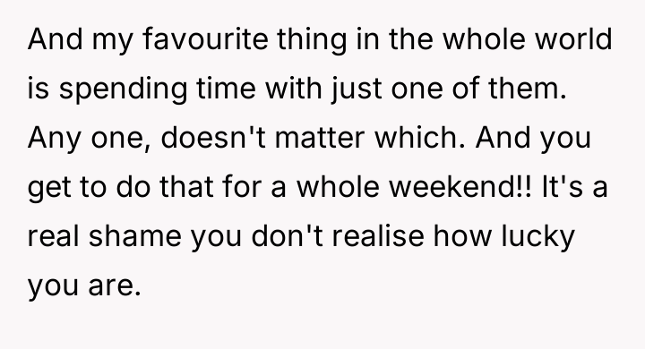 As renowned family therapist and researcher Dr. Christine Allen states, “In post-divorce co-parenting, the goal shifts from pleasing everyone to establishing clear, sustainable boundaries that serve the functional needs of the entire family unit, including the parents’ capacity to parent effectively.” The OP’s resistance stems from a justifiable need to protect the personal time she has built as a necessary coping mechanism and personal fulfillment structure post-divorce. Her established schedule allows her to manage the demands of nursing while ensuring her non-working weekends are restorative. The children’s request, while motivated by a desire for quality one-on-one time and reduced sibling conflict, directly challenges the OP’s established adult autonomy. The family's reaction suggests a misunderstanding of the emotional labor involved in co-parenting and the legitimate need for post-divorce decompression time, framing her boundary setting as 'selfishness.' The ex-husband’s immediate agreement highlights a potential difference in how the parents value their non-custodial time, which is common but needs careful navigation to avoid one parent feeling penalized. The OP’s actions in wanting to maintain her schedule are appropriate given the stability the current system provides and her career demands. However, completely dismissing the children's request may lead to resentment. A constructive recommendation is to explore a compromise: perhaps implementing the split schedule only during certain, less travel-intensive times of the year (e.g., during school months) or limiting the split to only one weekend per month, thus preserving the majority of her free weekends while still validating the children's stated needs.