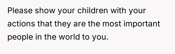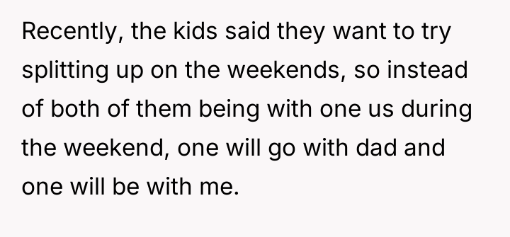 But now, a new chapter stirs from the innocent voices of their children, yearning for individual attention and connection. The proposal to split weekends, with one child visiting each parent, challenges the familiar routine yet promises a deeper bond, a chance to nurture their spirits one-on-one, even as life’s demands pull them in different directions. It is a poignant testament to love’s evolving shape in the face of change.