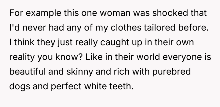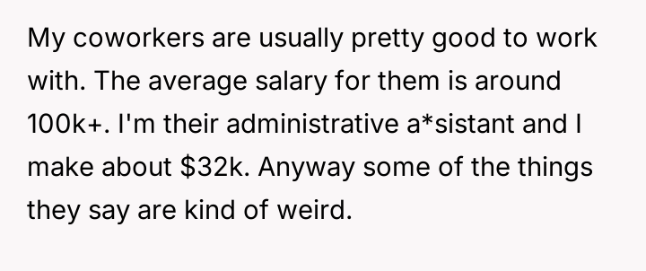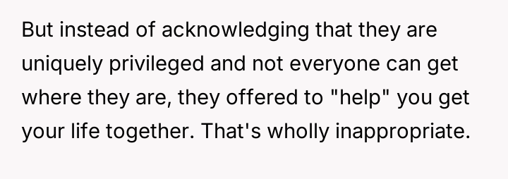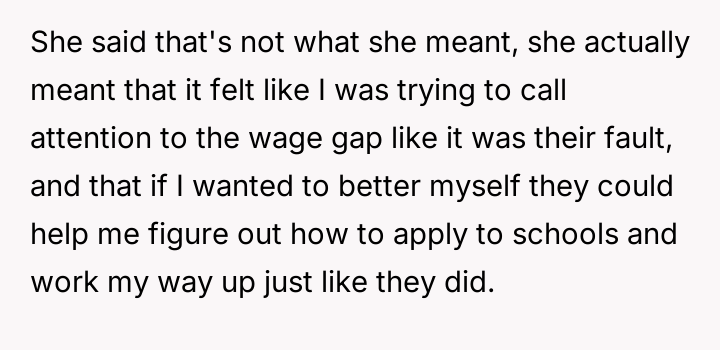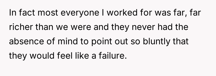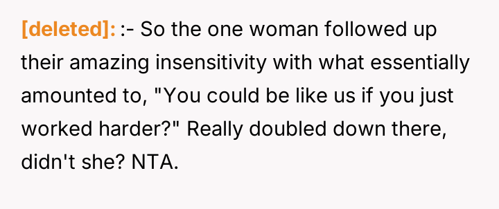 As renowned social psychologist Dr. Philip Zimbardo explains, "Context dictates behavior. In environments where wealth disparities are stark and unacknowledged, subtle social cues often replace direct communication, leading to unintentional but deep offense." The situation highlights a classic example of an in-group/out-group dynamic fueled by economic disparity. The coworkers, earning significantly more (around $100k+ versus the OP's $32k), operate within a bubble where homeownership in their 30s is the expected norm, leading to unintentional elitism. Their shock that the OP had never had clothes tailored or their dismissive attitude toward renting reveals a lack of awareness regarding economic diversity, not necessarily malice. The OP’s reaction to state their reality (“I’m 38 and rent, I don’t think I’m a failure”) was an understandable emotional defense against feeling implicitly judged as a failure. However, the subsequent interaction with the apologetic coworker revealed a miscommunication: the coworker interpreted the OP's comment as an accusation regarding the wage gap, offering unsolicited advice on career advancement. This demonstrates a failure in communication across different socioeconomic levels. A more constructive approach for the OP would have been to clearly state the impact of the comments using 'I' statements (e.g., 'When you said renting felt like a failure, I felt judged') rather than stating a defensive fact, which allowed the conversation to veer into assumptions about the OP's intentions (i.e., blaming them for the wage gap). Moving forward, the OP might benefit from setting gentle, non-confrontational boundaries when such topics arise, perhaps by redirecting the conversation back to work tasks.