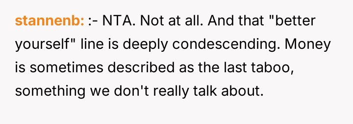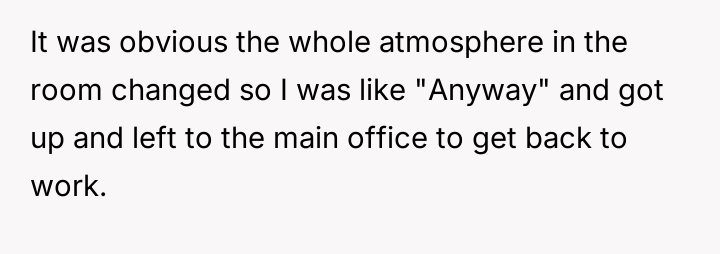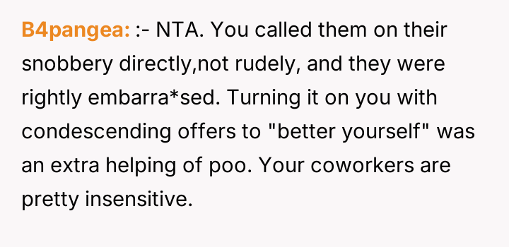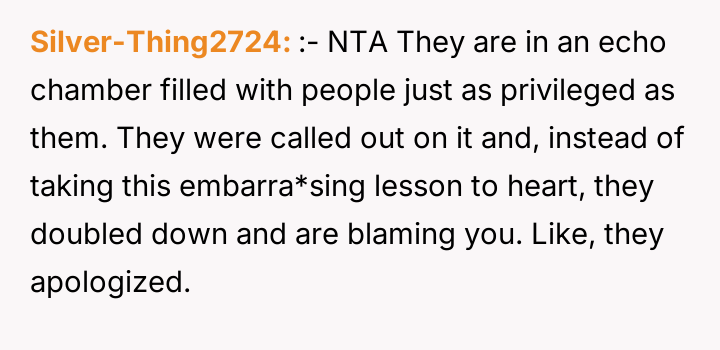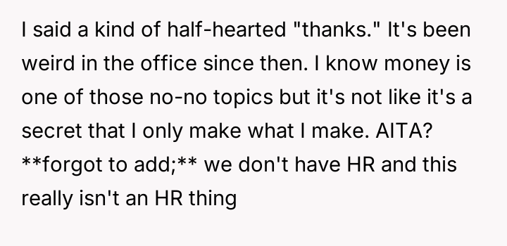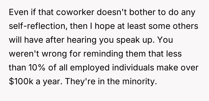 The original poster (OP) experienced frustration due to feeling marginalized and judged by coworkers whose high financial status and lifestyle created a disconnect from the OP's reality. The central conflict arose when the OP defended their situation after hearing insensitive remarks about renting and financial struggles, leading to an awkward confrontation and subsequent strained office atmosphere.