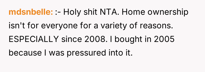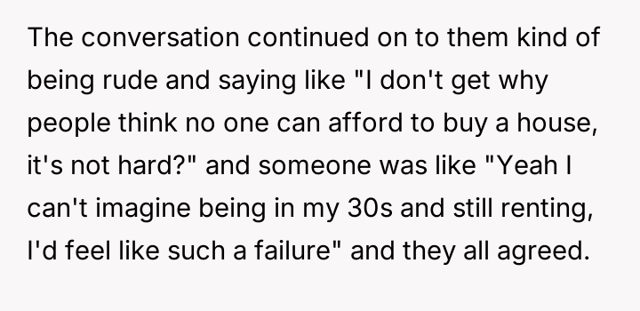 Was the OP justified in speaking up against the insensitive comments regarding homeownership and perceived failure, or did their interjection inappropriately shift blame onto colleagues who were simply discussing their own success metrics? The core question remains whether it is acceptable to challenge privilege in a professional setting when personal financial circumstances are brought up indirectly.