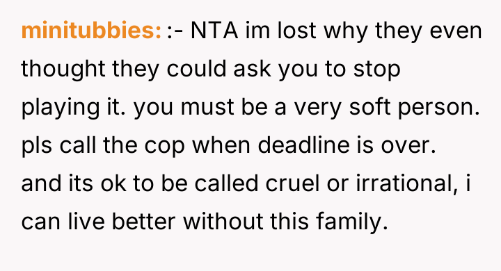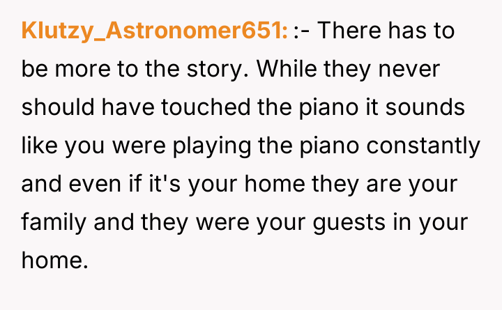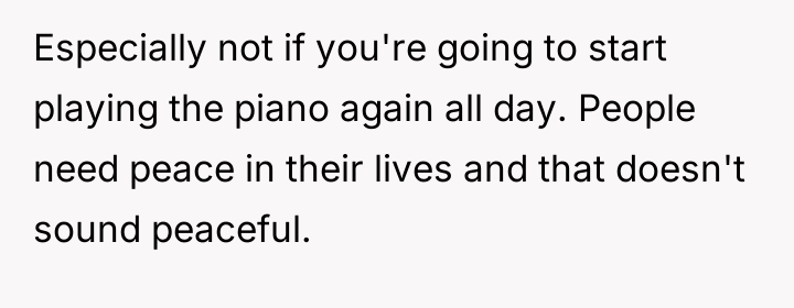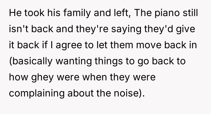 As renowned researcher Dr. Brené Brown explains, “Boundaries are the distance at which I can love you and me simultaneously.” This situation highlights a critical failure in establishing and respecting personal boundaries, complicated by the OP's vulnerable emotional state post-bereavement. The piano represented not just property, but a vital link to the deceased husband and a crucial coping mechanism for the OP. When the brother and sister-in-law complained, they were setting a boundary regarding noise, but the brother’s action—moving the piano without consent—was a profound violation of the OP’s personal space and agency, effectively weaponizing her grief comfort for their convenience. The brother's justification of moving the piano as a 'last ditch effort' and his subsequent sarcastic remarks indicate a lack of empathy and an attempt to shift blame. The OP’s reaction to immediately demand they leave, while emotionally understandable as a defense mechanism against violation, was an escalation that bypassed crucial steps in conflict resolution, such as involving a mediator (like the mother, before the escalation) or clearly negotiating time slots. While the OP was justified in being furious about the property theft, the best constructive recommendation would have been to firmly state that the piano's immediate return was non-negotiable, but perhaps to engage with family mediation before issuing an ultimatum to vacate, thereby separating the property dispute from the housing arrangement.