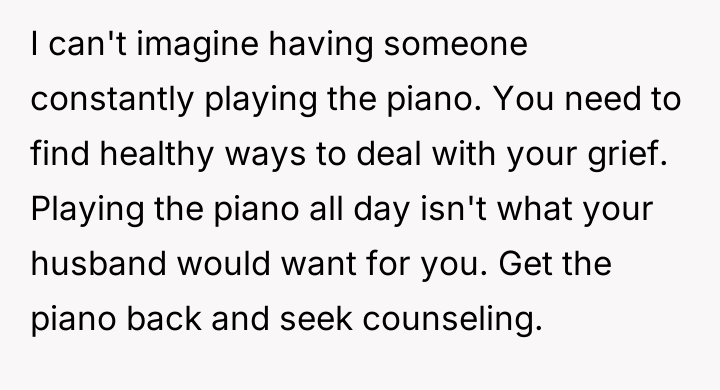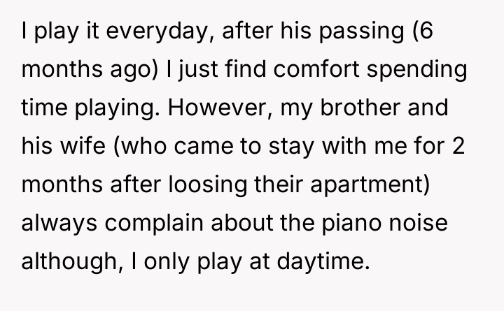 The original poster (OP) is dealing with significant grief following the loss of her husband, finding solace in playing the piano he helped her acquire. Her emotional need for this comfort directly clashed with her brother and sister-in-law's desire for quiet during their temporary stay, leading to a severe breach of trust when the brother unilaterally moved the piano.