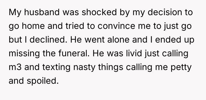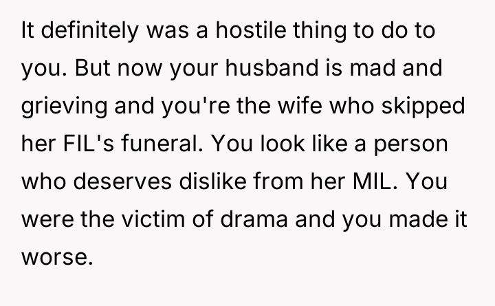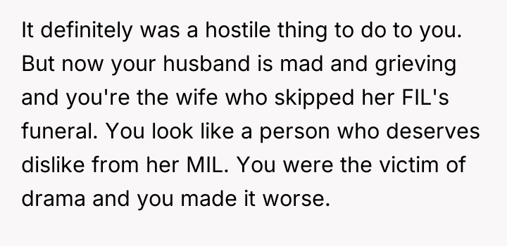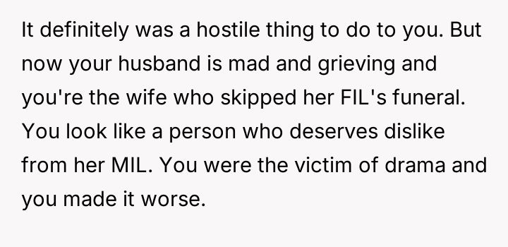 Was the OP justified in prioritizing the immediate emotional insult and perceived disrespect over attending the funeral of her late father-in-law, or did this action cause irreversible damage to her relationship with her husband and in-laws due to the circumstances? This debate questions where the line should be drawn between demanding respect and fulfilling familial obligations during a grieving period.