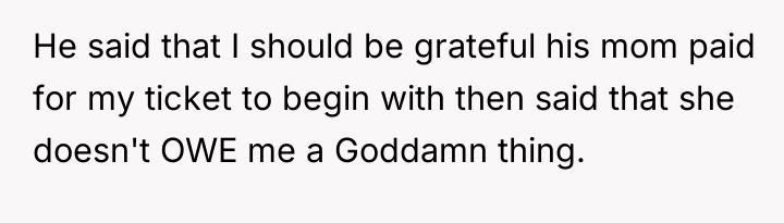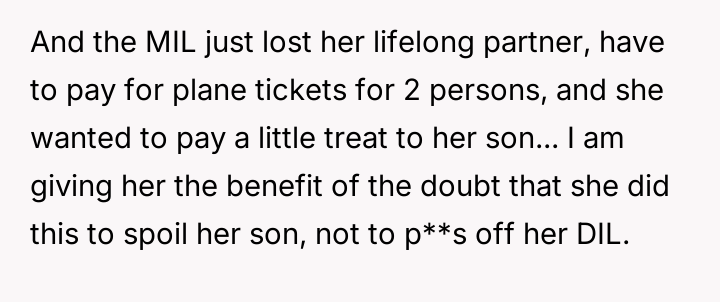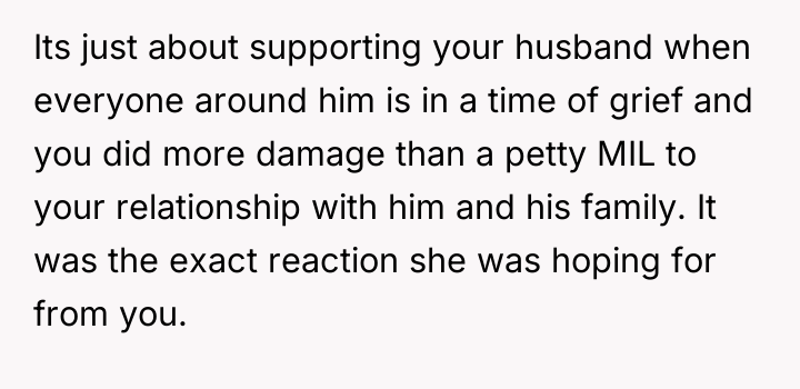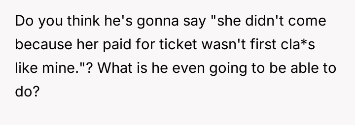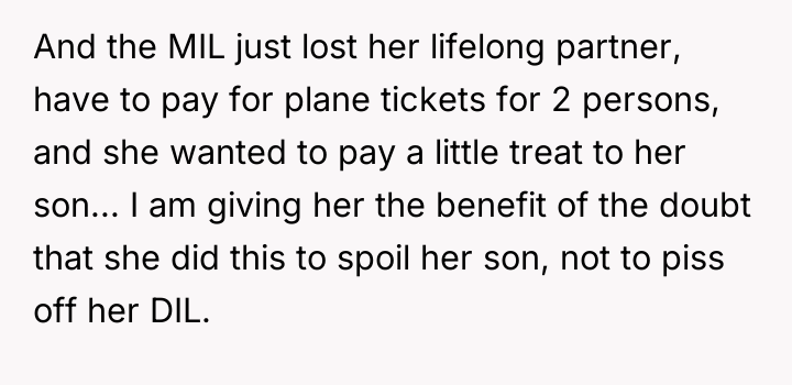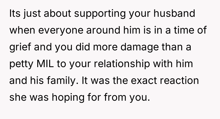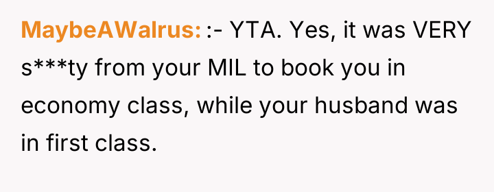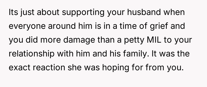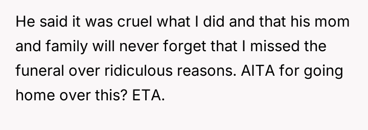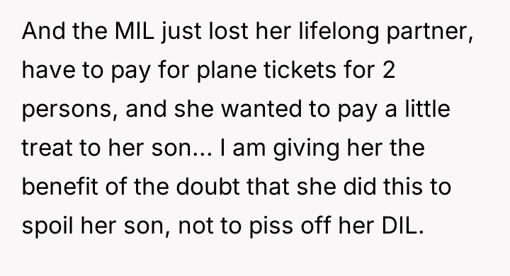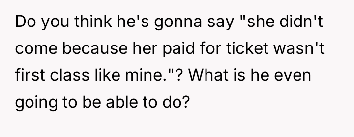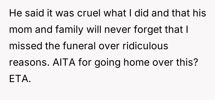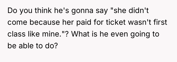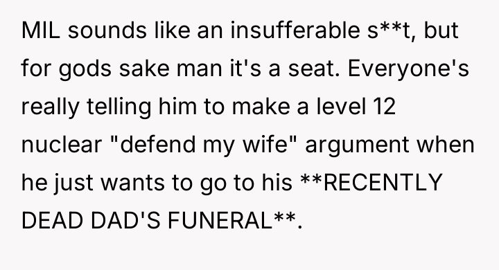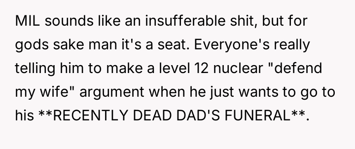 As renowned psychologist Dr. John Gottman explains, lockquote{The foundation of relationship security is trust, and trust is built in small moments of connection and reliability. When reliability is broken, especially over issues of respect, it erodes security.}. The situation highlights a significant breakdown in perceived fairness and consideration, stemming from the MIL’s deliberate action of separating the couple via disparate ticket classes. The OP interpreted this action not as a logistical oversight, but as a calculated act of passive aggression intended to belittle her status within the family unit, especially given the existing strained relationship. Her decision to leave, while extreme, was a reaction to feeling profoundly unsupported by her husband in that moment. The husband's immediate dismissal of her feelings, urging her to "suck it up," validated the OP's feeling of being devalued. His subsequent anger, framing her reaction as petty while emphasizing his mother's perceived generosity (paying for the ticket), shifts the focus from the act of separation to the OP's response, creating a defensive and accusatory dynamic. While missing a funeral carries severe social and emotional weight, the OP's initial motivation—needing to sit beside her grieving husband for support, as detailed in the ETA—was valid. However, the punitive reaction of leaving rather than attempting a constructive, immediate resolution (like offering to pay to upgrade her ticket or demanding the husband switch seats if possible) escalated the situation past the point of repair. The constructive recommendation is for the OP and her husband to address the dynamic of the MIL's passive aggression separately from the tragedy of the missed funeral. They must establish clear boundaries regarding how future arrangements will be handled to ensure mutual respect, rather than letting one party unilaterally dictate terms that invalidate the other's emotional needs.