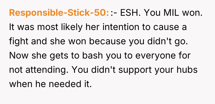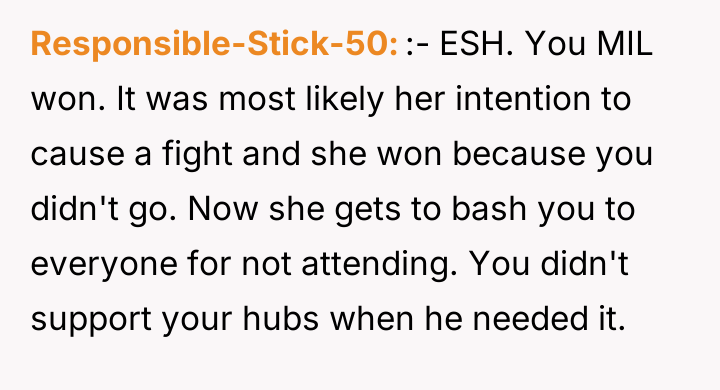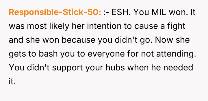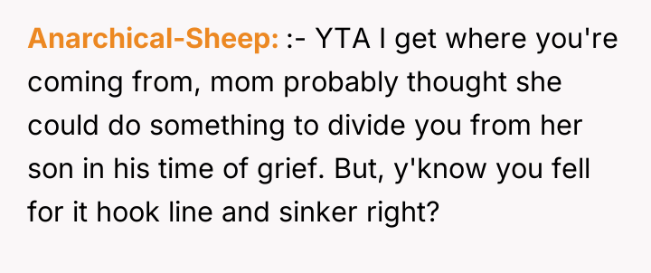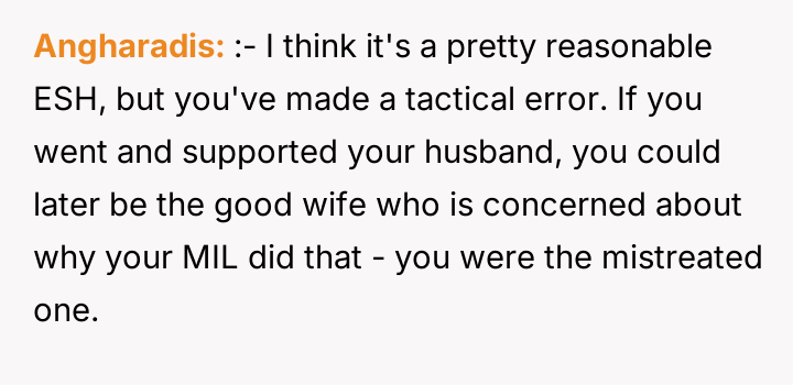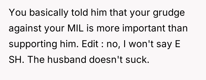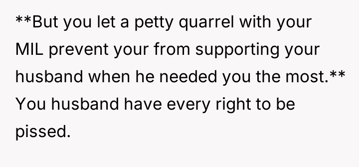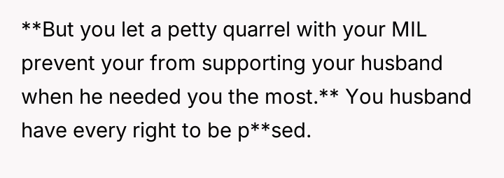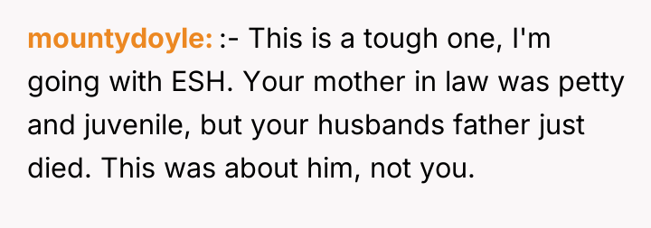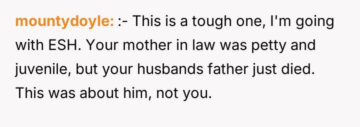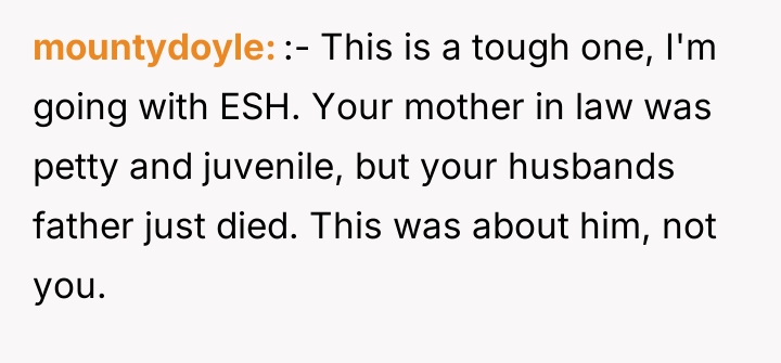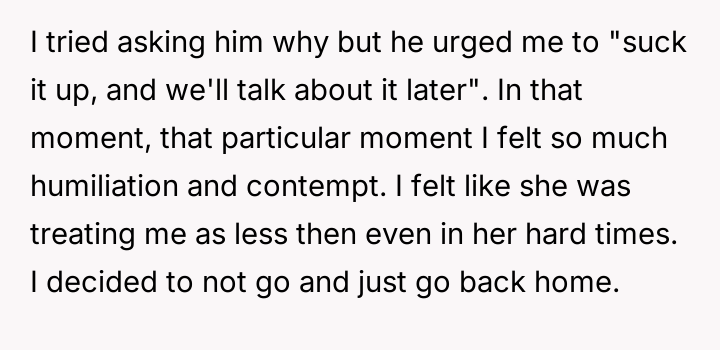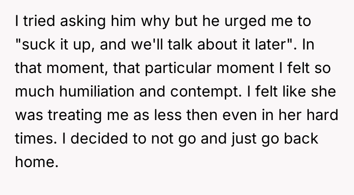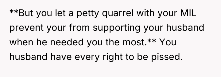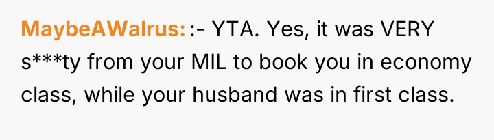 As renowned psychologist Dr. John Gottman explains, lockquote{The foundation of relationship security is trust, and trust is built in small moments of connection and reliability. When reliability is broken, especially over issues of respect, it erodes security.}. The situation highlights a significant breakdown in perceived fairness and consideration, stemming from the MIL’s deliberate action of separating the couple via disparate ticket classes. The OP interpreted this action not as a logistical oversight, but as a calculated act of passive aggression intended to belittle her status within the family unit, especially given the existing strained relationship. Her decision to leave, while extreme, was a reaction to feeling profoundly unsupported by her husband in that moment. The husband's immediate dismissal of her feelings, urging her to "suck it up," validated the OP's feeling of being devalued. His subsequent anger, framing her reaction as petty while emphasizing his mother's perceived generosity (paying for the ticket), shifts the focus from the act of separation to the OP's response, creating a defensive and accusatory dynamic. While missing a funeral carries severe social and emotional weight, the OP's initial motivation—needing to sit beside her grieving husband for support, as detailed in the ETA—was valid. However, the punitive reaction of leaving rather than attempting a constructive, immediate resolution (like offering to pay to upgrade her ticket or demanding the husband switch seats if possible) escalated the situation past the point of repair. The constructive recommendation is for the OP and her husband to address the dynamic of the MIL's passive aggression separately from the tragedy of the missed funeral. They must establish clear boundaries regarding how future arrangements will be handled to ensure mutual respect, rather than letting one party unilaterally dictate terms that invalidate the other's emotional needs.