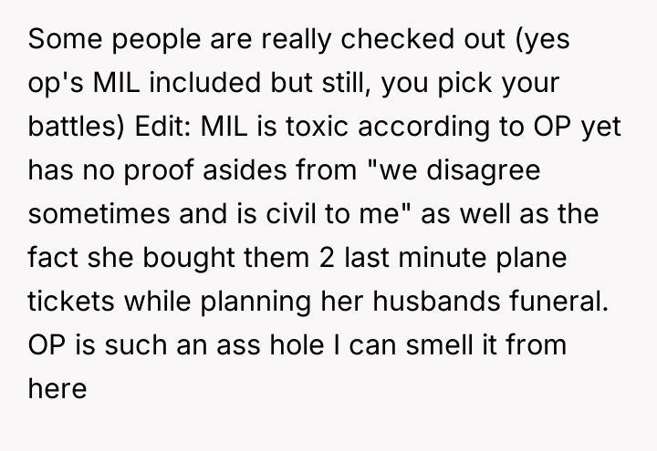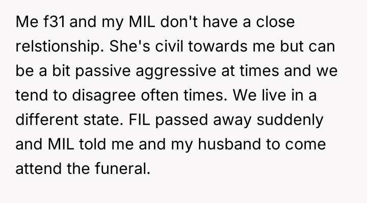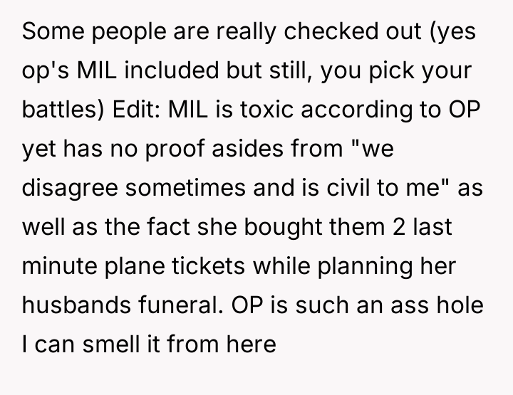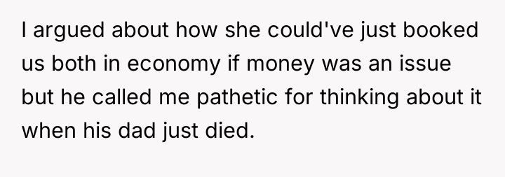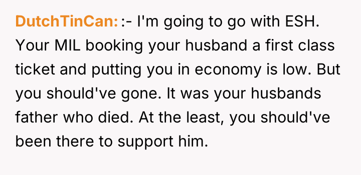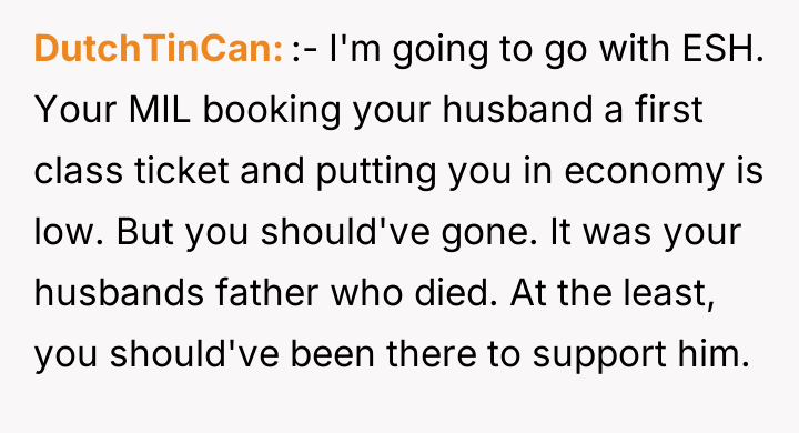 AITA for missing my FIL's funeral after my MIL booked my husband first class but me ecconomy?