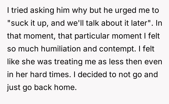 In that crushing moment, humiliation and heartbreak surged through her, breaking the fragile bonds she had tried to maintain. Choosing dignity over discomfort, she refused to endure the silent rejection and stayed behind, watching her husband leave alone to mourn a loss she was barred from sharing, igniting a storm of anger and harsh words that threatened to unravel their marriage.