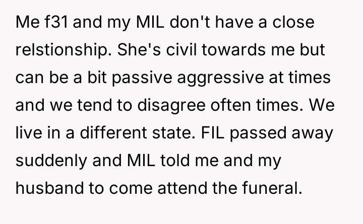 The original poster (OP) experienced deep feelings of humiliation and disrespect when their mother-in-law (MIL) deliberately separated her seating arrangements for the flight, causing the OP to prioritize her feelings of worth over attending her father-in-law's funeral. The central conflict lies between the OP's need for equitable treatment and spousal support versus the expectations placed upon her to be grateful and overlook perceived slights during a time of family crisis.