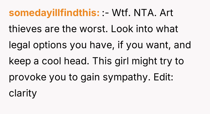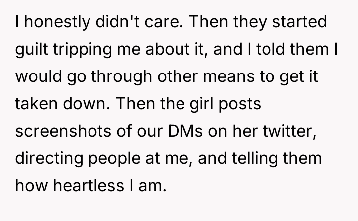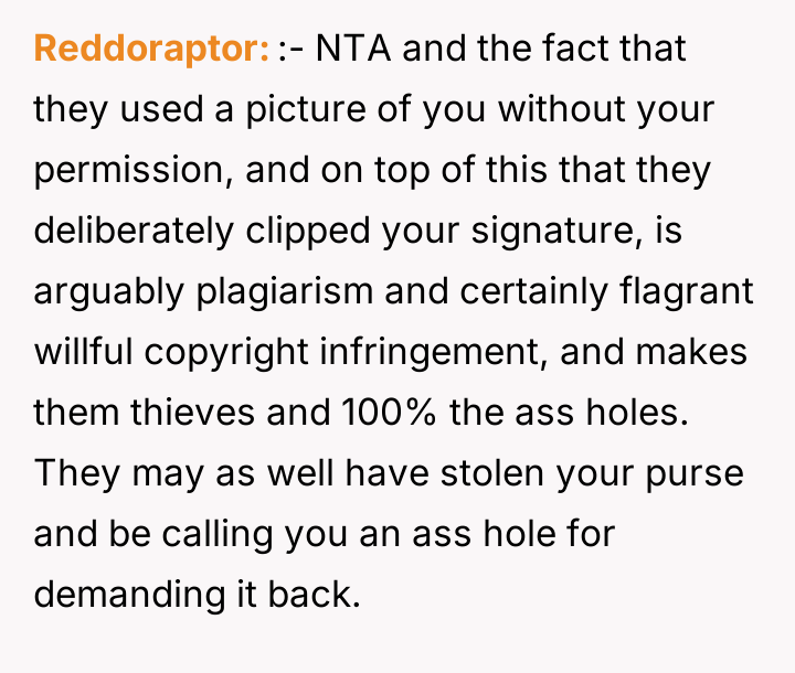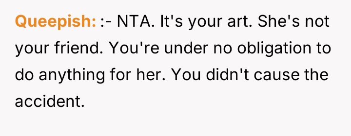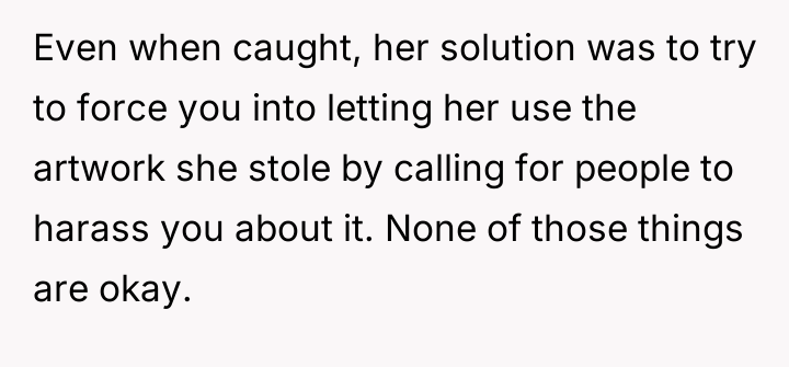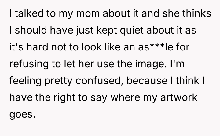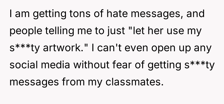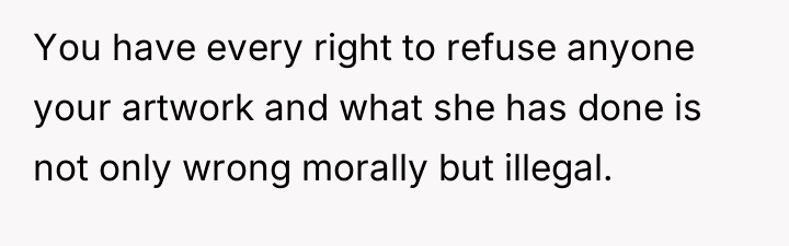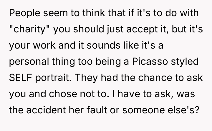 As renowned intellectual property lawyer and author, Professor Mark Lemley explains, “Copyright vests in the creator automatically upon fixation in a tangible medium of expression, and no one else has the right to copy, distribute, or display that work without permission.” This foundational legal principle confirms that the OP holds the exclusive right to control how their self-portrait is reproduced and distributed, regardless of the charitable intent behind the infringement. The conflict here is rooted in a collision between property rights (copyright) and moral/emotional expectations (charity and sympathy). The classmate and her friend displayed poor judgment by using the artwork without permission, likely operating under the belief that charitable causes grant exceptions to standard intellectual property rules, or perhaps viewing the OP's reluctance as selfish. The subsequent public shaming and dissemination of private messages escalate the situation from a copyright dispute to one of cyberbullying and emotional manipulation. While sympathy for the injured girl is understandable, it does not legally or ethically void the OP's ownership rights. The OP's actions to defend their copyright were appropriate, as unauthorized use of intellectual property is a clear violation. However, the response to the guilt-tripping should involve clear, non-emotional communication, potentially involving a parent or school administrator if direct communication fails. Moving forward, the OP should focus on documenting the unauthorized use and communicating strictly through formal channels rather than engaging in public disputes on social media.