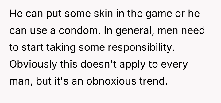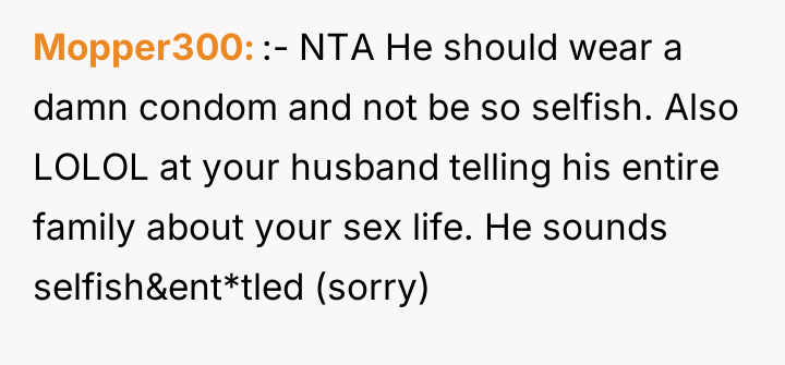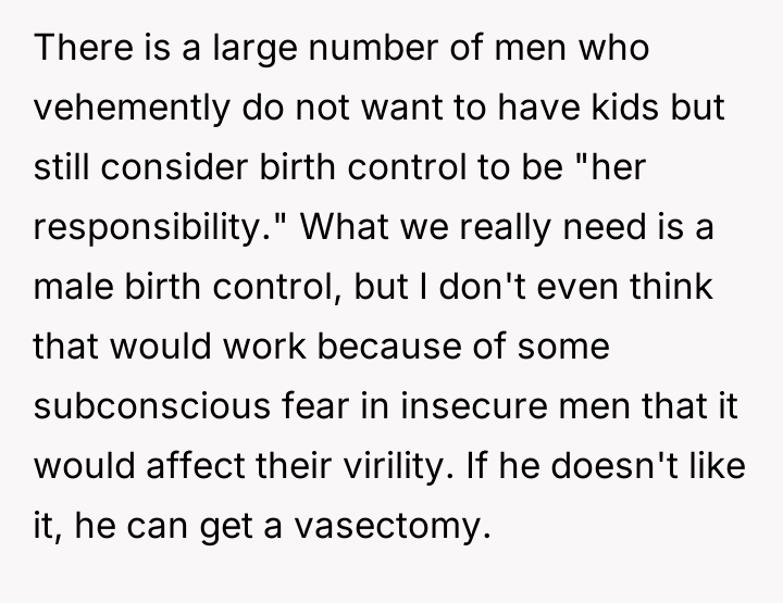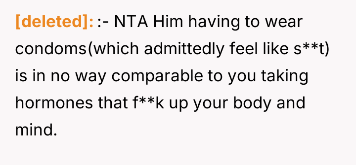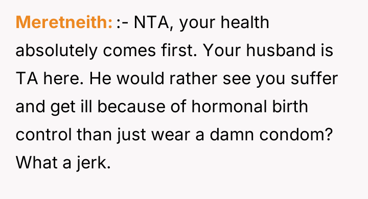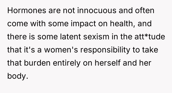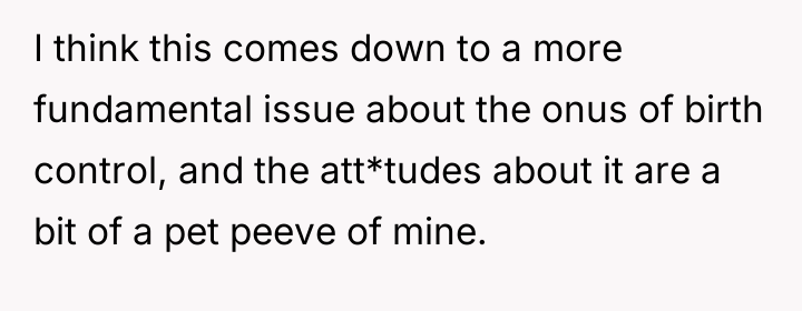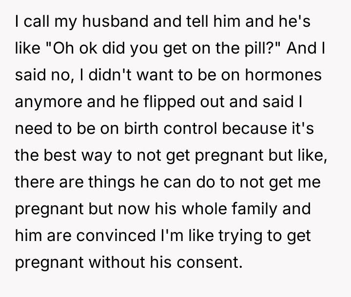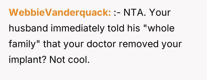 The husband’s extreme reaction—immediately jumping to the conclusion that the OP is trying to conceive without his consent—suggests underlying issues of trust and perhaps differing views on autonomy versus partnership in reproductive matters. While the OP is correct that she controls what enters her body, the husband has a legitimate stake in preventing an unplanned pregnancy. Her reliance on condoms as a replacement is deemed insufficient by him because condoms require active participation from him and are less reliable than a long-acting implant, framing his reaction as an attempt to enforce his preferred level of contraceptive security.