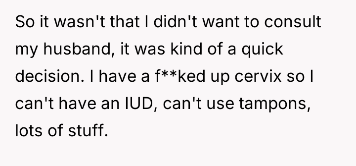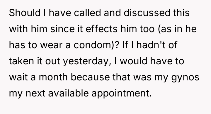 Given the disparity in how the decision was made—the OP acting on medical advice versus the husband reacting with fear of non-consent—the core question remains: Does a person have the sole right to remove their own long-acting, shared-risk contraceptive method without first consulting their partner, even when medical urgency is involved, or is the partner's right to consent to contraceptive cessation more important in a shared-risk situation?